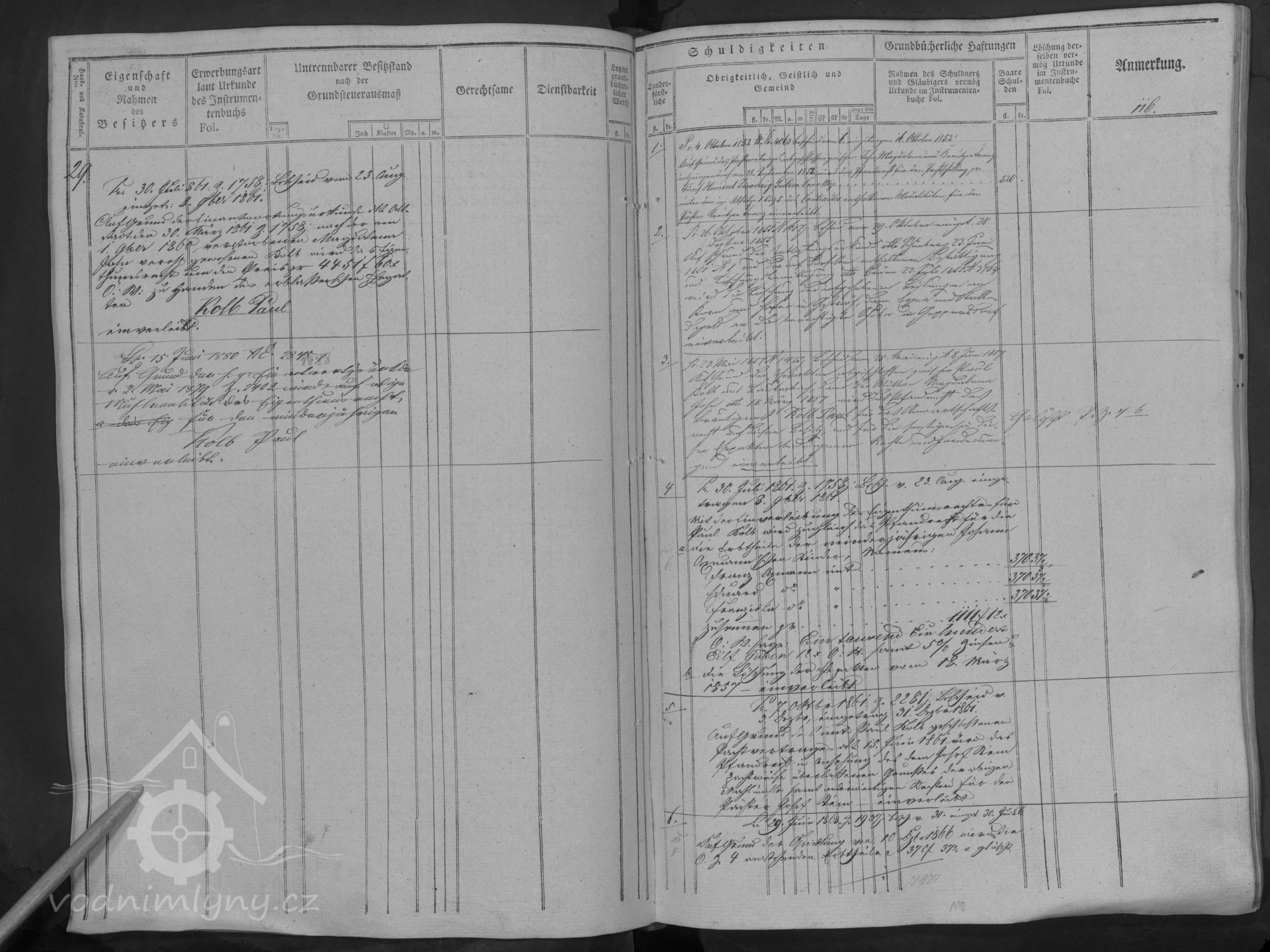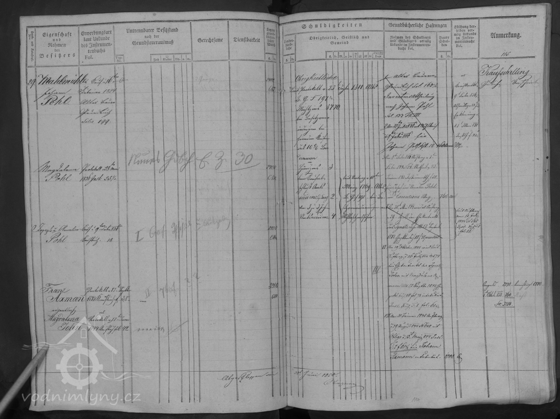 První zápis v gruntovní knize se vztahuje k roku 1824, kdy mlýn vlastní Johann Pohl, následně v roce 1836 Magdalena Pohl, od níž mlýn téhož roku kupuje Jozepf a Amalie Pohl.