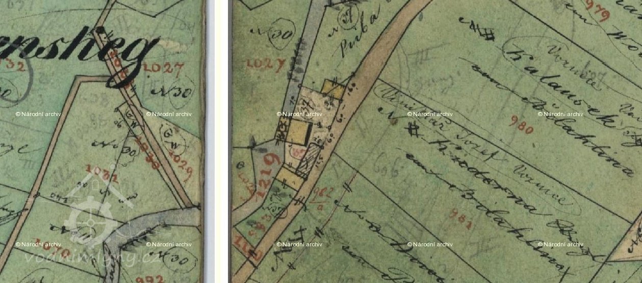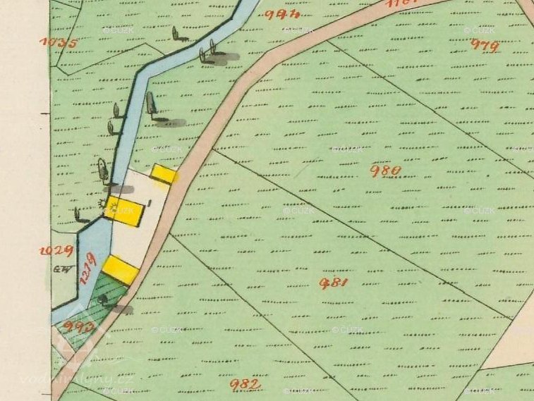 17. ledna 1803 prodal Jan Holub vodní mlýn s 8 měřicemi a 10,5 čtvrtce selských rolí Josefu Rybovi za 5 000 zlatých. Nový majitel přikoupil ke mlýnu 14. února 1805 od Jana Líkaře z čp. 35 16 měřic a 7,5 čtvrtce rolí za 1 150 zlatých a 22. června 1810 navíc zdědil po své manželce Alžbětě dalších 22 měřic a 8 čtvrtců rolí za 325 zlatých a 31 ¾ krejcaru. Díky tomu bylo při mlýně celkem 47 měřic a 10 čtvrtců selských rolí a celé hospodářství bylo odhadnuto na 6 475 zlatých a 31 ¾ krejcaru. Josef Ryba postoupil mlýn 2. září 1834 manželům Františku a Alžbětě Rybovým za 4 828 zlatých a 18 krejcarů. Z indikační skici stabilního katastru od adjunkta 2. třídy Franze Rösslera a geometra 4. třídy Josefa Klapzuby z roku 1840 vidíme, že ještě tehdy byl celý mlýnský areál dřevěný.