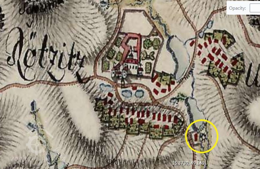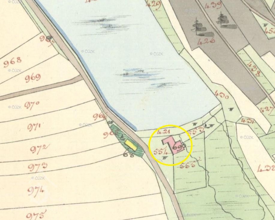 "Pod obcí je rybník Dolní, při němž jest nyní jen pila; druhý bývalý mlýn "Bazar" zvaný, zbořen 1907."