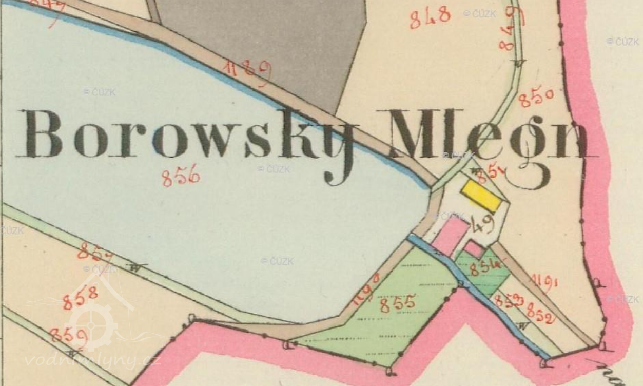 Dne 10. září 1810 se novým majitelem Borovského mlýna stal mlynář Mathias Piech. Jak mlýn v této době vypadal nevíme, ale písemnosti z roku 1821 uvádí, že již byl označen číslem popisným 28 a přináležely k němu polnosti pojmenované "pole za rybníkem horní", "pole za rybníkem prostřední", "pole za rybníkem dolní", " u Žlabu" a "u palouku", o celkové výměře 10 jiter, 1273 a 5/6 sáhu, tj. 6,21 ha. K mlýnu patřily též louky nesoucí pomístní názvy "utopená pod rybníkem", "pod hrází" a "u palouku", o rozloze 1286 a 1/6 sáhu, tj. 0,46 ha. Z mlýna platil mlynář Piech vrchnosti roční nájem ve dříve stanovené výši 27 zlatých rýnských.