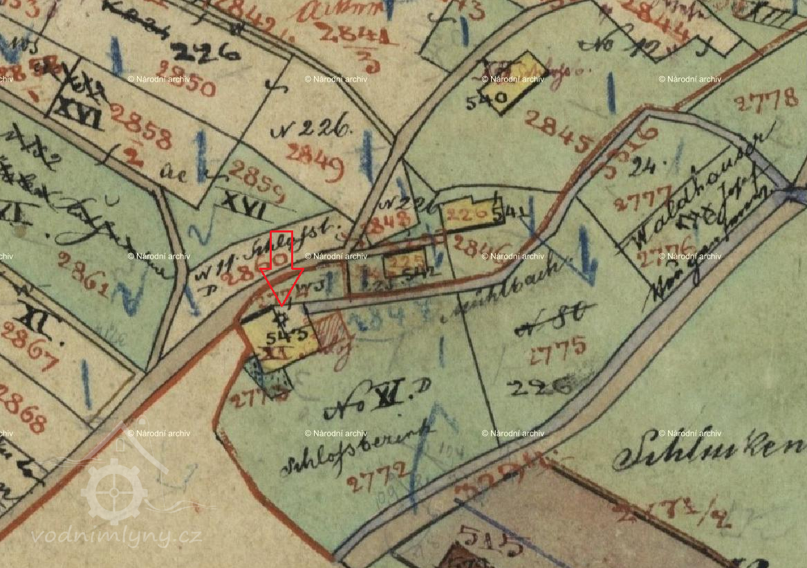 V soupisech poddaných a v matrikách města Šluknov byl mlýn uváděn jako Schlossmühle nebo jako Mühle im Schlossbezirk, který stál v ulici nazývané Schlossmühlgasse.