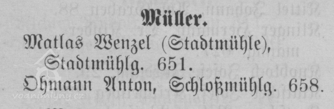 Podle matričního zápisu z 20. 9. 1879 o narození dcery Marie Sidonie hospodařil tehdy na Zámeckém mlýně mlynář Franz Anton Ohmann s manželkou Marií Helenou, rozenou Riedel. Mlýn převzal po svých rodičích Antonu Ohmannovi a Eleonoře, rozené Lorenz.