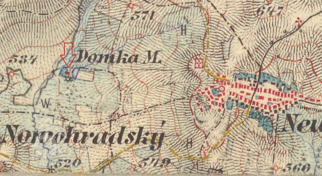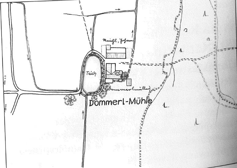 Mlýn byl založen kolem roku 1863 Johannem Bauerem, sedlákem z Nové Vsi. Ten dal na mlýn převést čp. 42 z nemovitosti, kterou v Nové Vsi vlastnil. Současně získal mlýn název po usedlosti zvané Domerl – Domerlmühle. Bauer u mlýna vybudoval vodní nádrž k pohonu vodního kola.