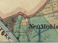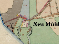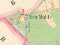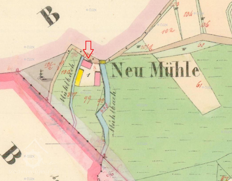 I. vojenské mapování z let 1764–1768 zobrazuj mlýn s rybníkem. Po hrázi rybníka probíhala katastrální hranice mezi Českou Vsí a Zahájím. Rybník ležel na úžení České Vsi, mlýn na území Zahájí. Tato situace je potvrzena na mapách stabilního katastru z roku 1838.