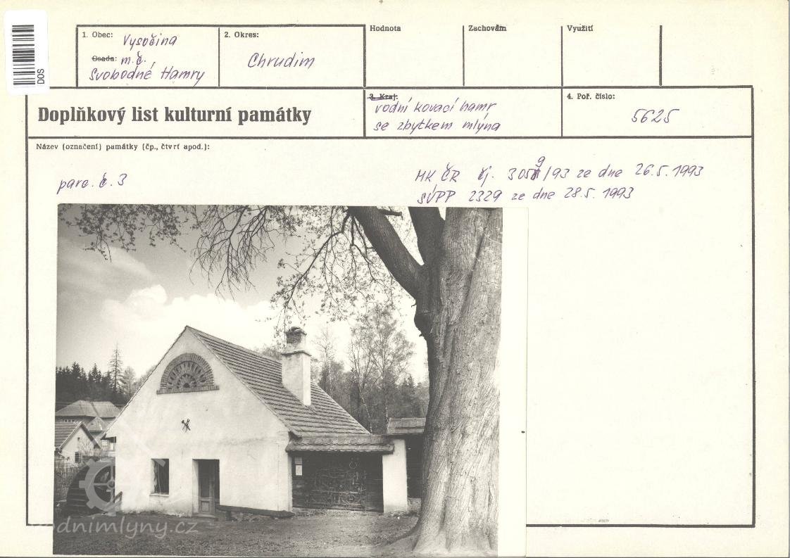 V obci Svobodné Hamry se železo vyrábělo již v 15. století v kusových pecích, v 16. a 17. století pak v tzv. dýmačce. Hutní hamr sloužil jako panská kovárna do začátku 19. století, po zrušení vodního bucharu pak jako běžná kovárna až do padesátých let 20. století. Panský mlýn u hamru na místě pece dýmačky vyhořel roku 1929. Během výstavby skanzenu lidových a technických staveb Vysočina byly v roce 1981 na historickém náhonu (parcela 3) mlýn i hamr s technickým zařízením obnoveny jako železářská expozice (v roce 1993 zapsány na seznam kulturních památek). Stojí poblíž zámečku čp. 1 ze 17. století, kdysi správní budově tehdejší železné hutě, součástí areálu byla i protější hospoda čp. 4.