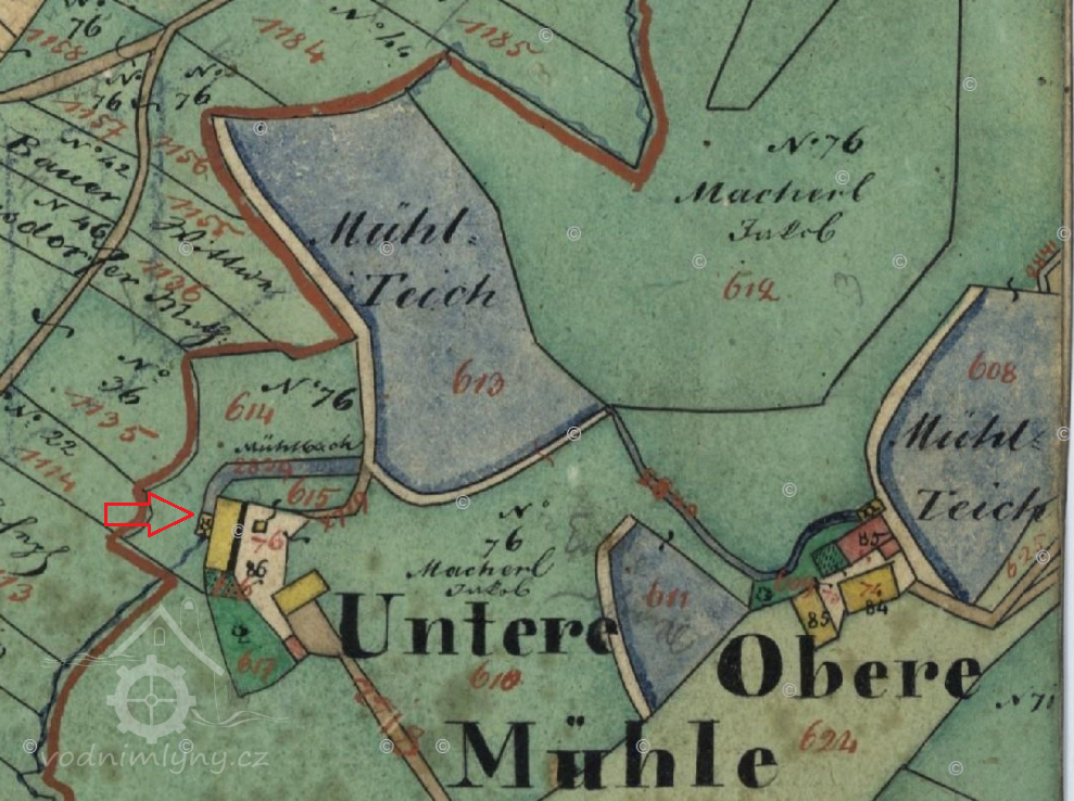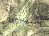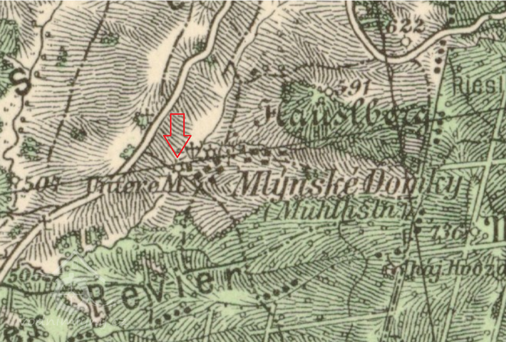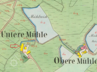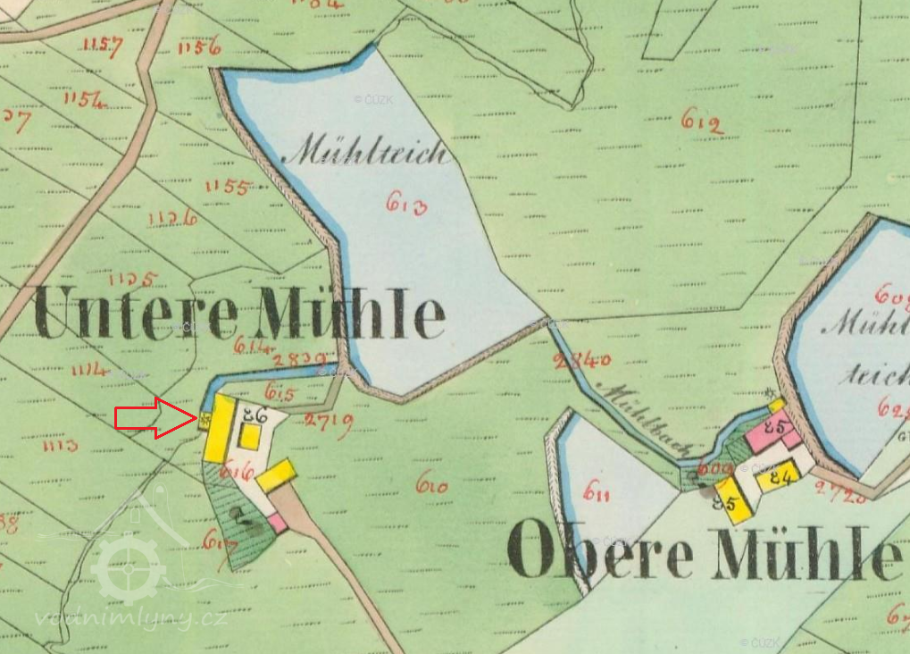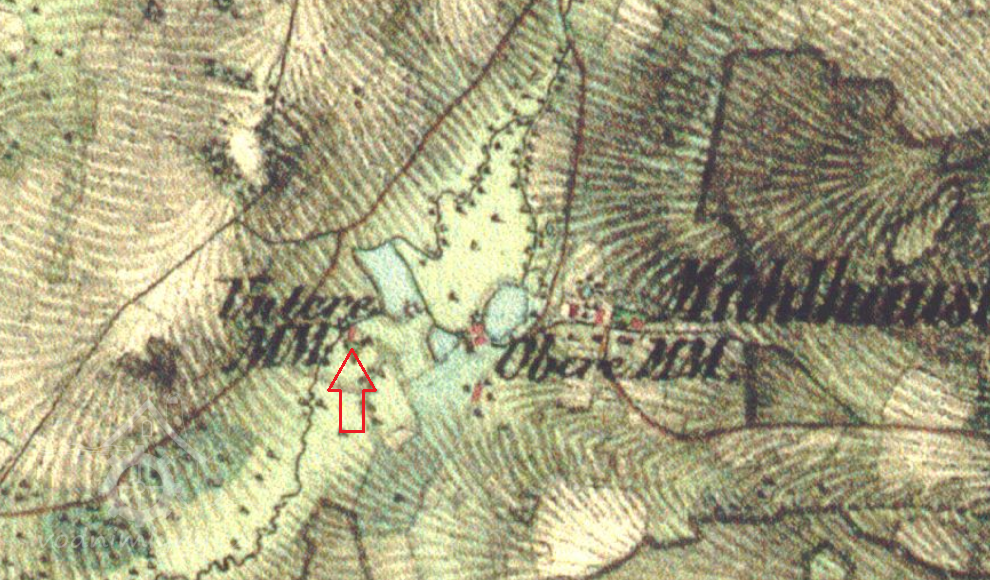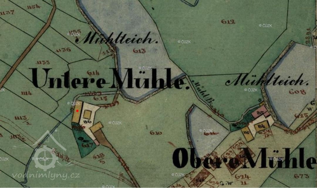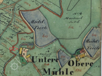 Na mapě I. vojenského mapování je zakreslena osada pod názvem Mühl Häuser s Dolním mlýnem pod hrází největšího rybníka.