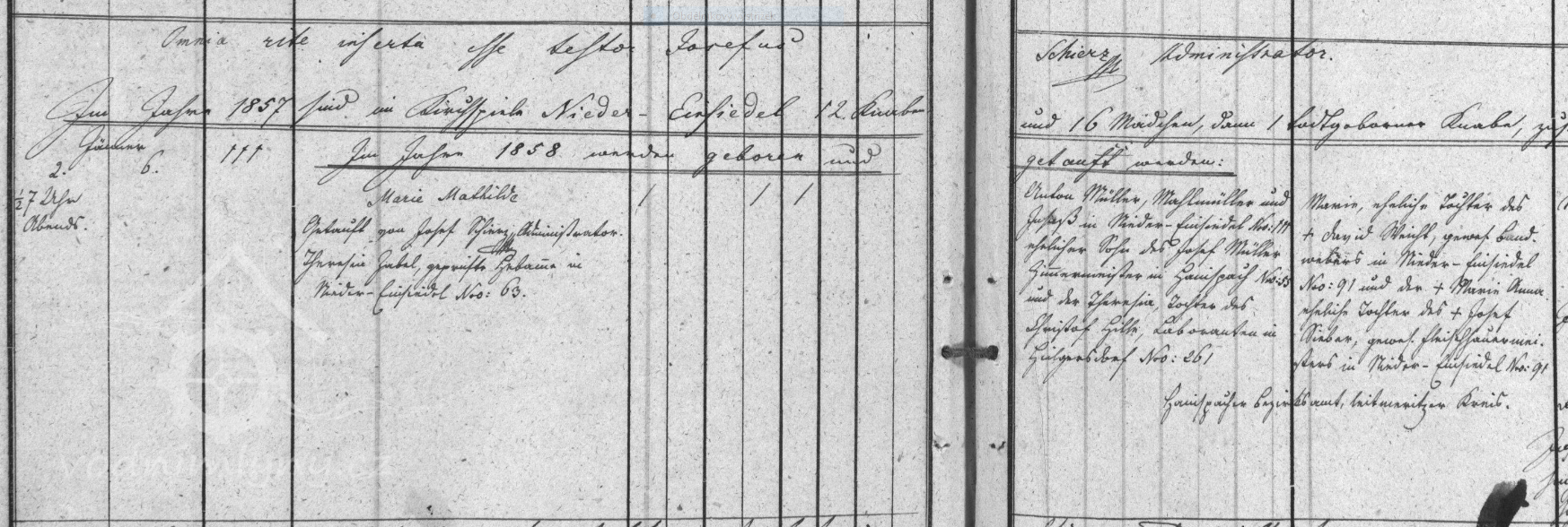 V roce 1856 provozoval mlýn mlynář Anton Müller, který sem přišel z obce Lipová, a jeho manželka Maria. Zápis v matrice je zde uvádí v říjnu 1856 při narození jejich syna Emila Johanna a ještě v lednu 1858 při narození dcery Marie Mathildy.