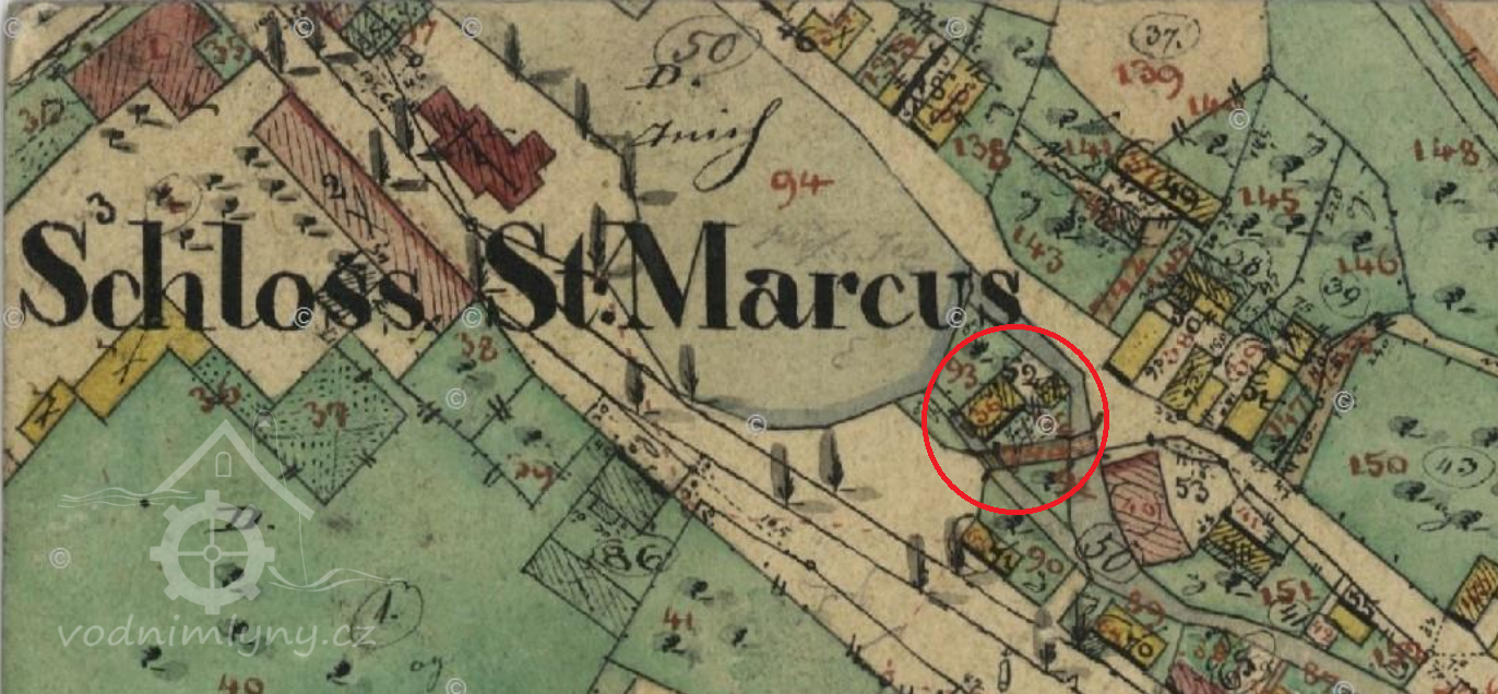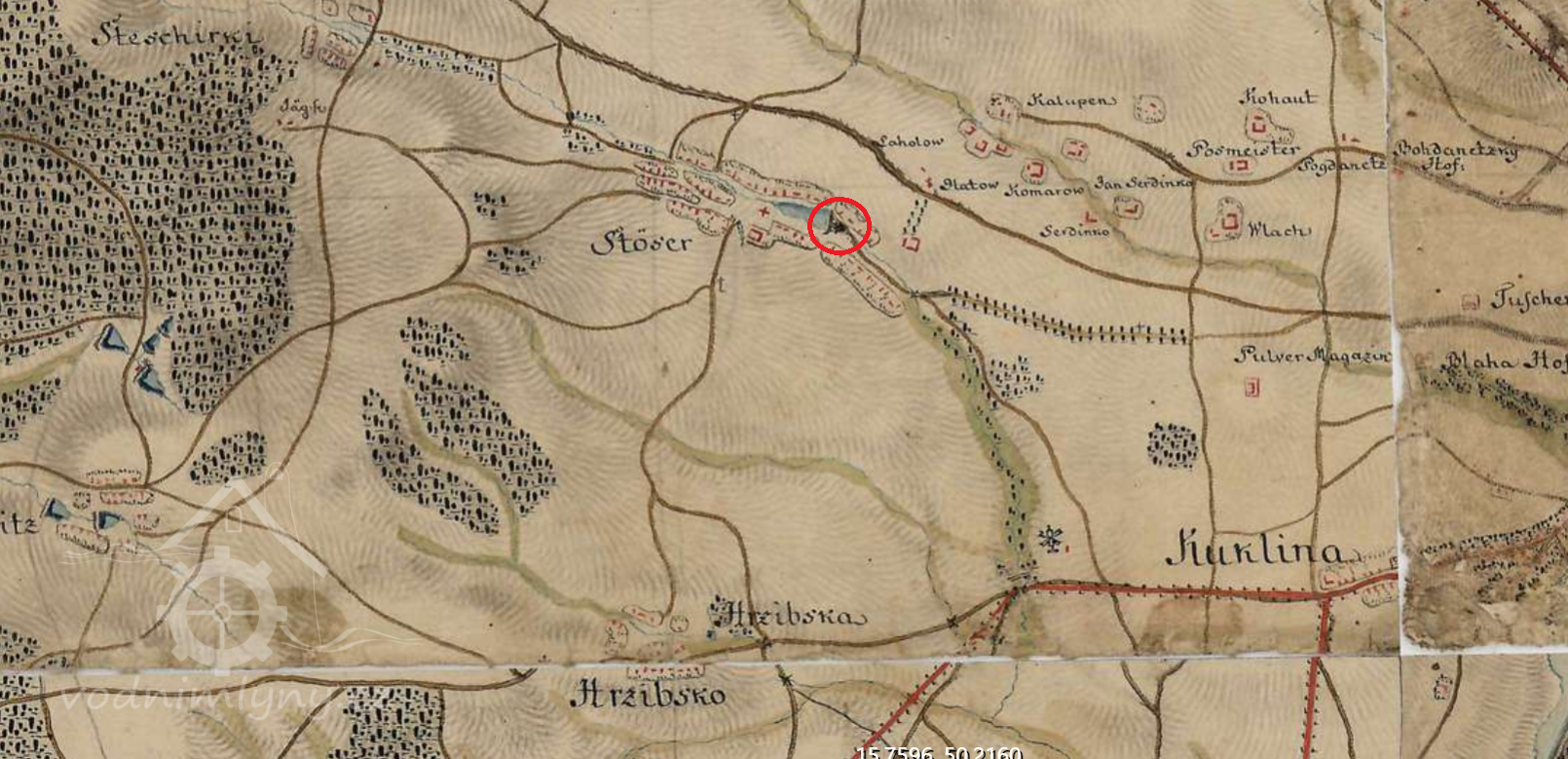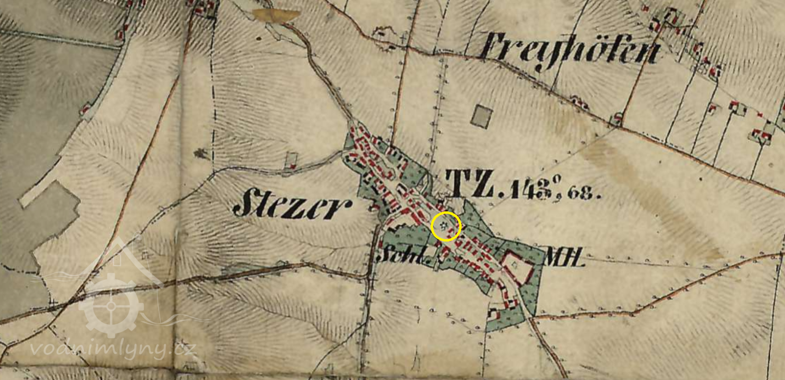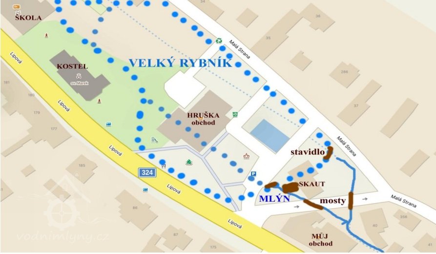 Již roku 1654 - byl ve Stěžerách pod Velkým, podkostelním rybníkem Harrachův mlýnek na jedno kolo. Voda byla přiváděna na kolo dřevěným žlabem, kterému se říkalo vantroky, kde obecní lázeň byla, koupaly se děti a ženské zde máchaly prádlo. Poblíž byla krčma. Voda od mlýnského kola tekla pod dřevěným mostkem do dvora krčmy (2025 Můj obchod), teprve potom do Struhy (Plačický potok). Další dřevěný most byl hned vedle přes Struhu, pro vodu, která vytékala ze stavidla. V obci hospodařil harrachovský statek a 5 sedláků Harrachem přesídlených z Horní Branné.