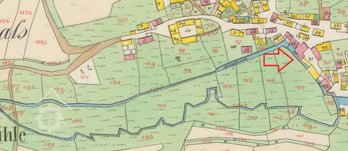 Mlýn uveden již na 1. VM. v 19. stol. náležel k majetkům Johanna Adama Geipela spolu s koželužnou a pilou. Mlýn byl poškozen válečnými událostmi, v 50. letech byl stržen. Dnes je zde výběh pro dobytek.