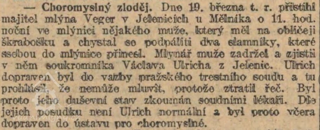 Bylo to veliké soužení pro všecko okolí. Loupežná chasa se objevila náhle tu i tam, přepadla statek, a než se lidé mohli seběhnout k obraně, byli ti lotři zase v prachu. Lidé před nimi nebyli jisti ani jměním ani životem. Daleko se Petrovští odvažovali - jednou se také dostali až ke mlýnu v Jelenicích u Mělníka. Tam ale byla statečná mlynářská chasa a také té noci bylo tam pár mlečů, silných chlapíků, a tak se jelenický mlýn Petrovským ubránil. Museli odtáhnout s nepořízenou, někteří s krvavými hlavami, jeden tam dokonce ztratil ruku, mlynářský chasník mu ji sekerou uťal. Vůdce loupežníků zuřil a přísahal, že se pomstí. Vymyslil si lest. Přistrojil se za zámožného měšťana, sedl na koně a jel do Jelenic. Tam u mlýna slezl a vešel dovnitř, aby poprosil o doušek vody.