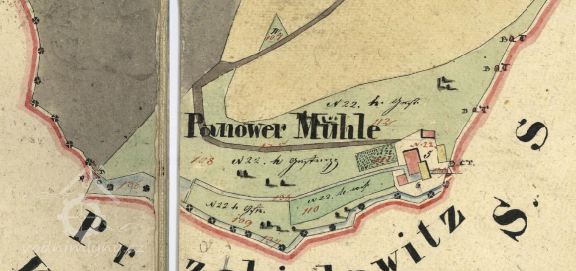 PopisV r. 1930 zde bylo 1 kolo na svrchní vodu, průtok 0,087 m3/s, spád 4,3 m, výkon 3,3 k.