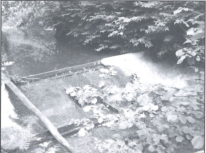 Ve vzdálenosti 245 m od mlýna se nacházel jez, protože byl v tehdejší době poškozený, tak byl bez prahu a opravený pouze kamenivem. Levý břeh náhonu za mlýnem byl zpevněn štětem (v délce 3 m), poté kamennou zdí, která končila u lávky (Vodní kniha, sv. VIII, 1892, s. 293–294).