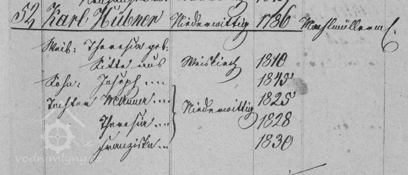 Johann Karl Hübner se oženil s Veronikou Möhr, dcerou sedláka z Bílého Kostela. Tento pár byl na mlýně čp. 1 uváděn od roku 1814, kdy se jim v březnu narodilo první dítě, dcera Veronika. Do roku 1834 se rodila rozrostla o 11 narozených dětí, většina však zemřela v dětském věku. Od listopadu 1836 při narození syna Adolfa je po boku mlynáře uváděna 2. manželka, kterou byla Theresie Sitta, původem opět z Bílého Kostela. Z druhého manželství vzešlo 6 dětí, synové Adolf, Franz, Antonius, Josef a dcery Mathilde a Marie. V roce 1848 je tento pár uváděn v čp. 1 společně se synem Josefem (narozen 1845) a třemi dcera z mlynářova prvního manželství.