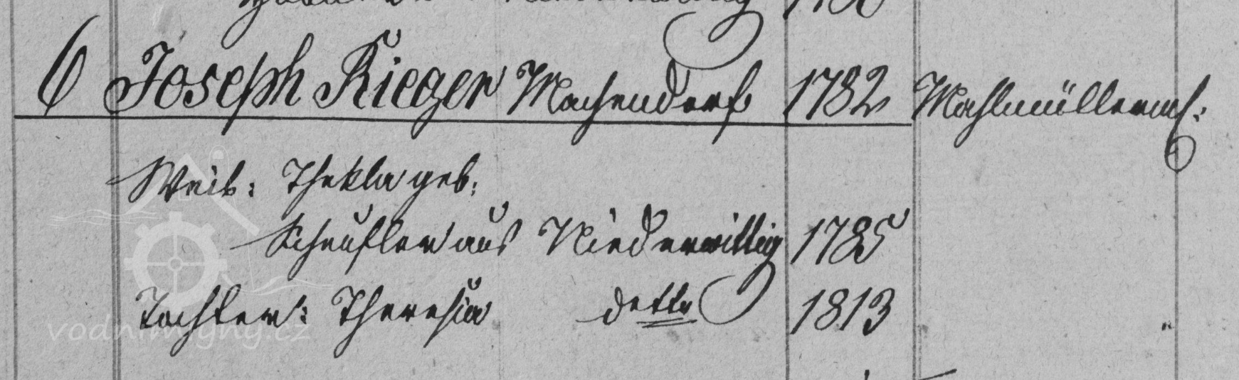 Od 80. let 18. století do začátku 19. století zde byl uváděn mlynář Ignatz Scheufler s manželkou Barbarou, rozenou Effenberger, dcerou pekařského mistra z Raspenavy u Frýdlantu. Žádný ze synů Ignatze Scheuflera /Johann Anton (1788), Johann Karl (1789), Anton (1793) a Ferdinand (1795)/ mlýn nepřevzal. Dalším mlynářem se zde stal jeho zeť Josef Rieger, který se v roce 1805 oženil s mlynářovou dcerou Theklou (narozena 1783), v listopadu 1805 se páru narodilo první dítě, dcera Johanna. Josef Rieger patrně původně nebyl mlynářem, protože až do roku 1809 byl jako mlynářský mistr zmiňován stále Ignatz Scheufler, u Riegera bylo zapsáno, že je zde mlynářským učněm. Poprvé byl Josef Rieger uváděn jako mlynářský mistr v říjnu 1809 v zápise o narození syna Josefa Franze, příštího mlynáře. Josef Rieger s Theresií zde hospodařili ještě v roce 1848, z manželství vzešlo kromě syna Franze (1809) ještě dalších 7 dětí: Johanna (1805), Josef (1807), Thekla (1808), Veronika (1811), Theresia (1813), Karolina (1816) a Franziska (1823).