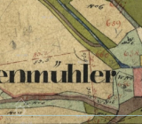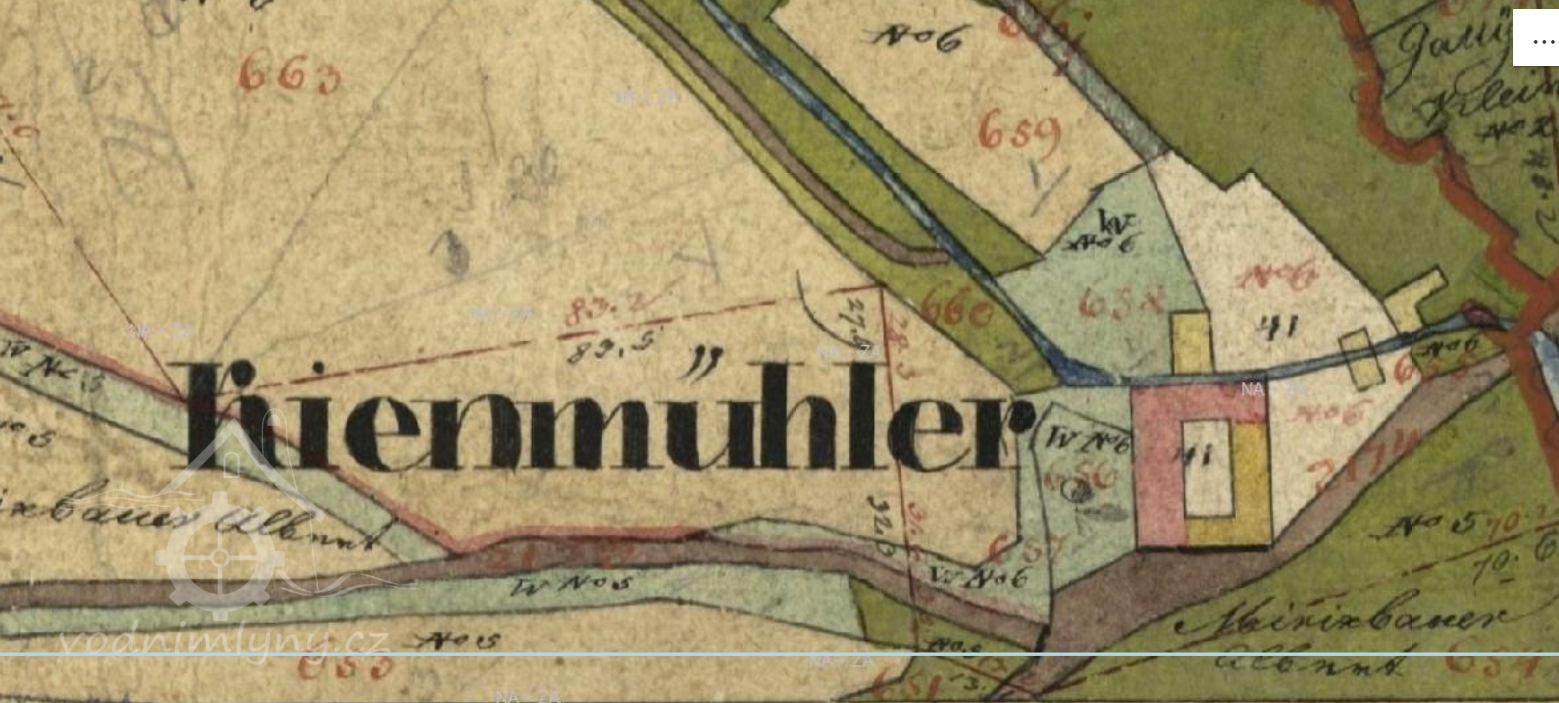 1654 Berní rula: Matěj Keinmüllner, vlastní mlejn o 1 kole, 20 str. rolí, 1 ks hov. dobytka, 5 ovec, 3 prasata