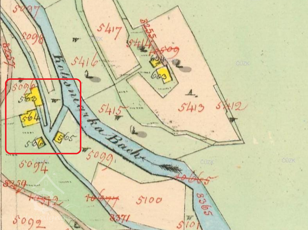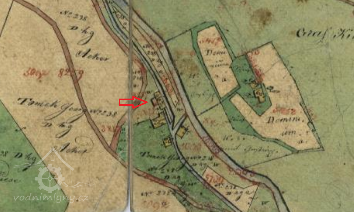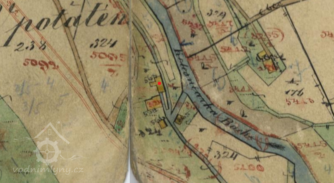 Popis1930: 1 kolo na spodní vodu, hltnost 0,25 m3/s, spád 3,4 m, výkon 1,8 HP