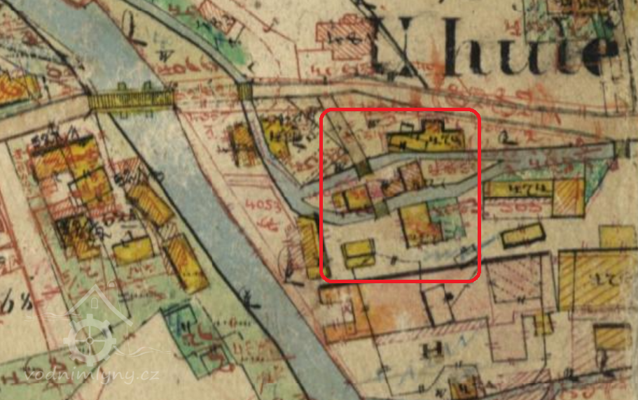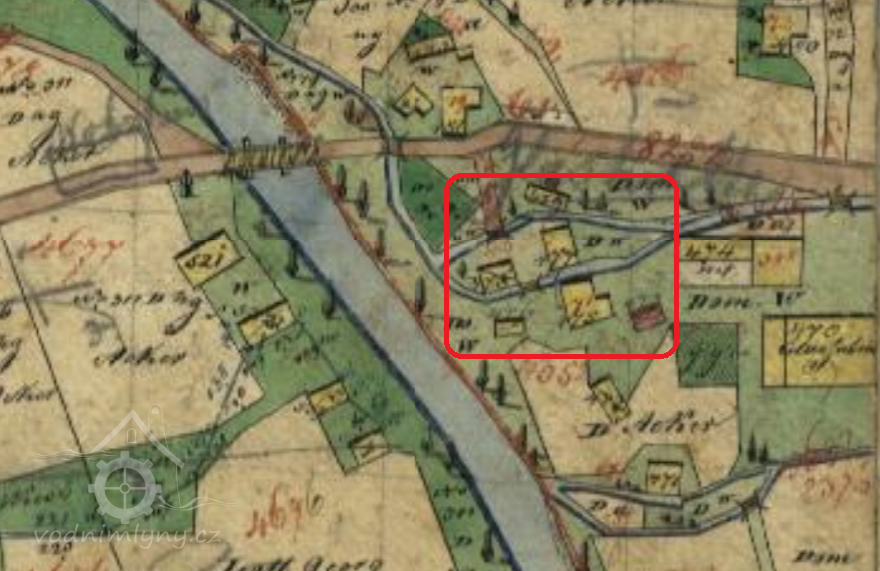 Na konci 19. století náhon vedl podél cesty a následně se rozdvojoval před Panským domem. Spodní náhon poháněl brusírnu sklárny a horní vedl k mlýnu, pile a "stupárně", kde se mlel křemen pro sklárny. Před mostem stála ještě velká pila patřící sklárnám (později vyhořela).