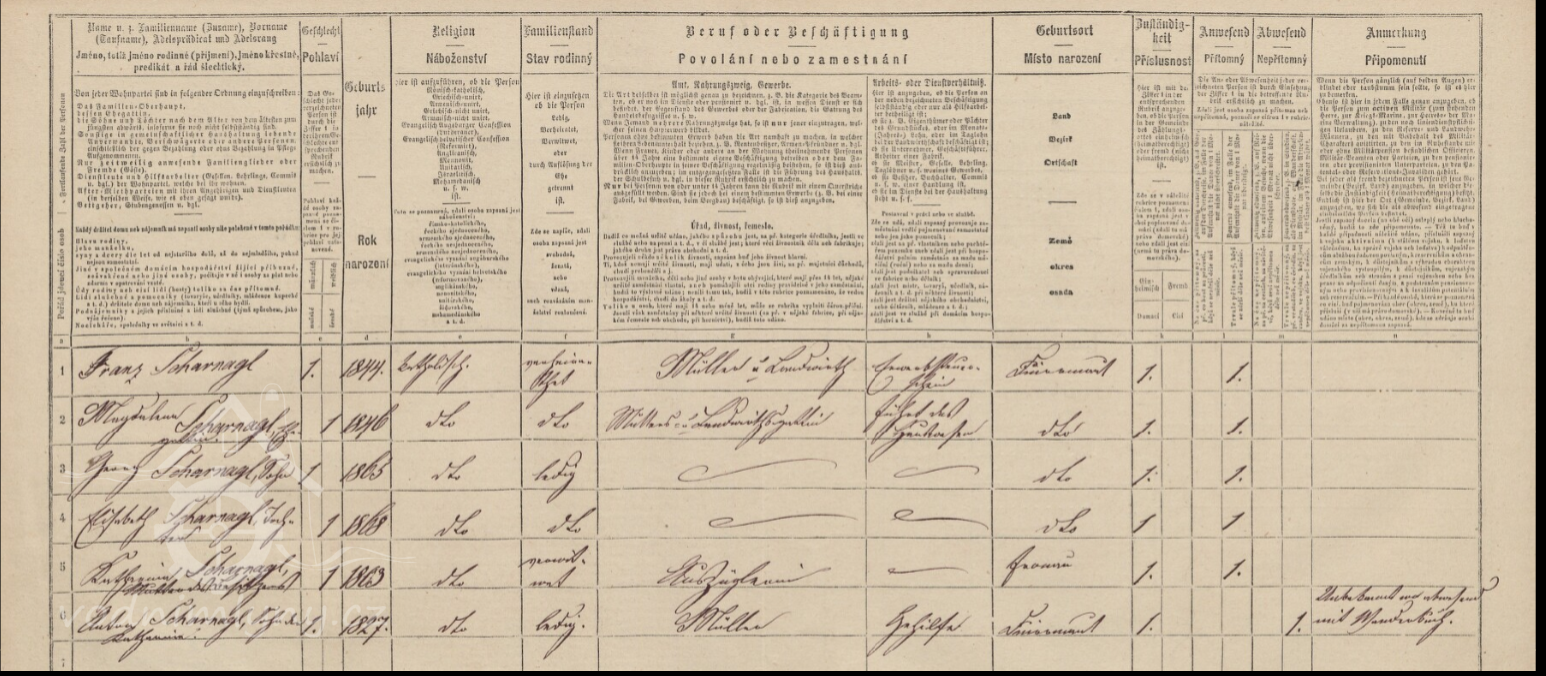 Mlýn převzal Franz Scharnagl, syn předchozího mlynáře, narozený v roce 1844. Sčítání obyvatel v roce 1869 ho zde zastihlo s manželkou Magdalenou (1846), rozenou Woderer, která byla dcerou hospodského v obci Drmoul čp. 22, s dětmi Georgem (1865) a Elisabeth (1868). Na mlýně žila na výměnku mlynářova matka Katharina a zapsán zde byl bratr Anton, který byl také mlynář, ale nezdržoval se zde. V hospodářství mlýna byli evidováni 2 voli, 2 krávy, 1 býk a 2 telata.