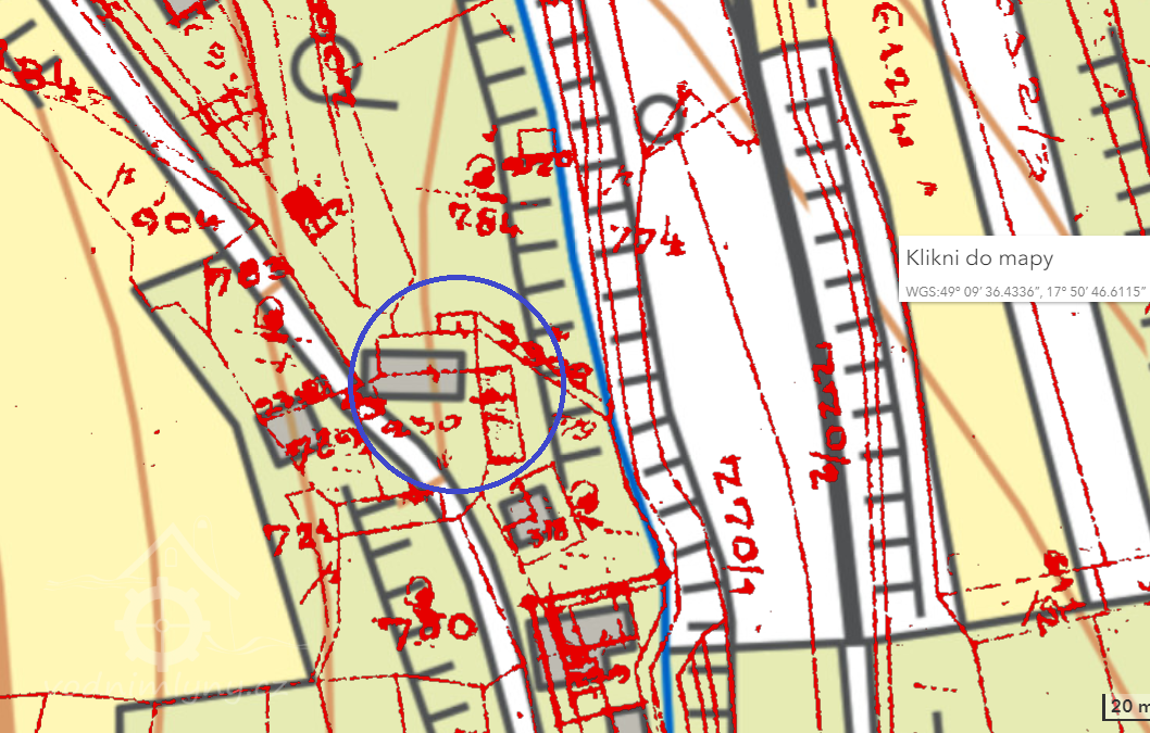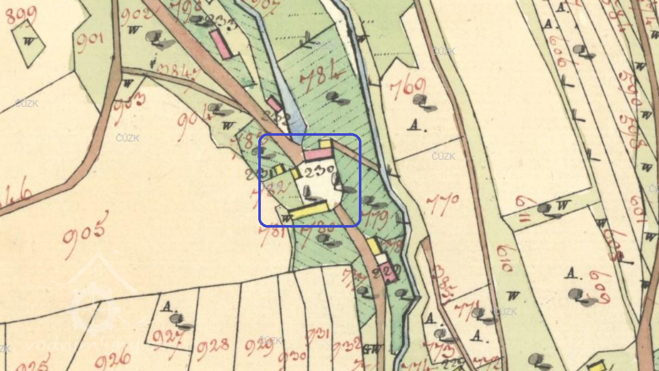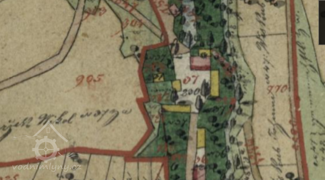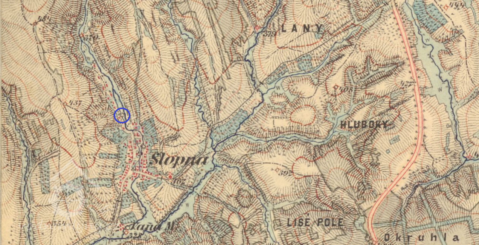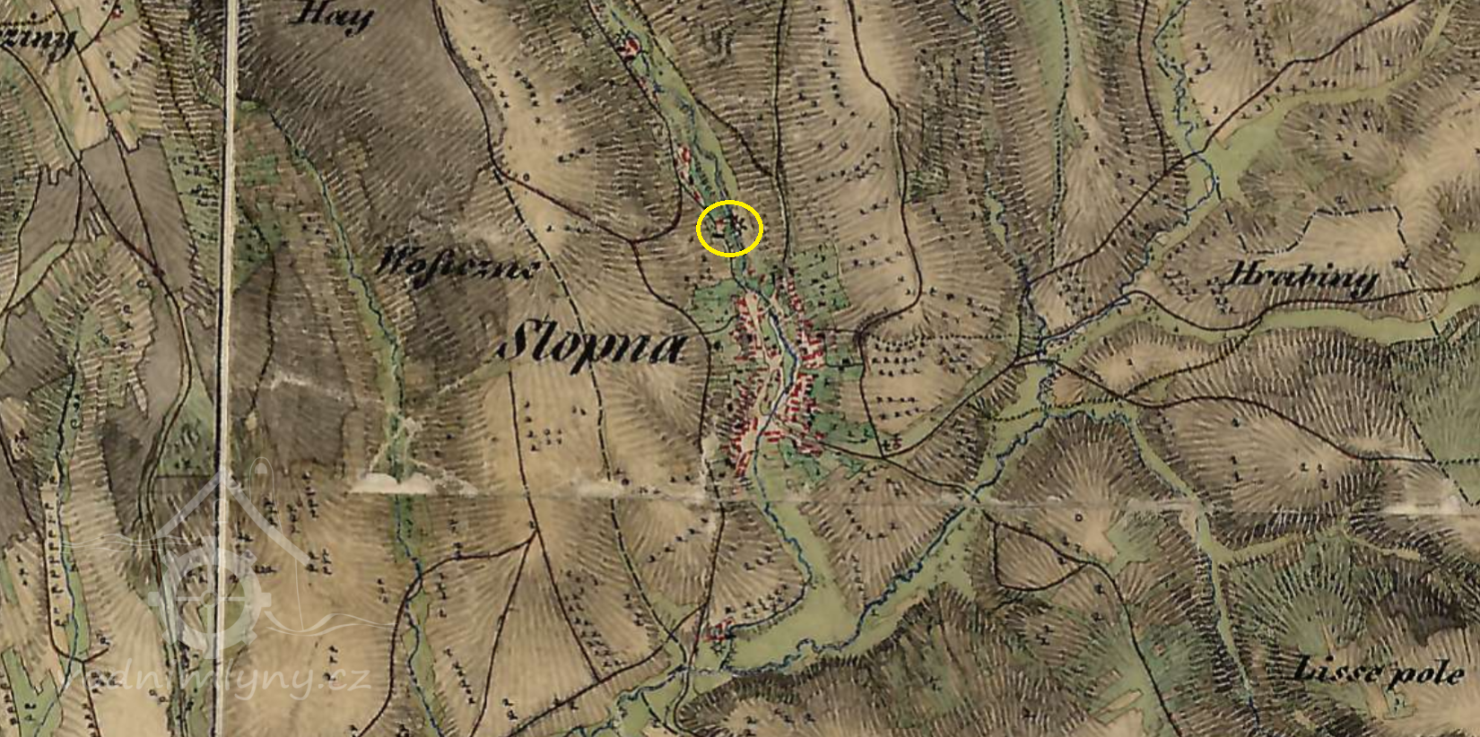 Velký spád potoka umožnil vybudování celé kaskády mlýnů, které nefungovaly současně a byly postaveny na 6 místech. První se nacházel pod skálou Čertovica, ta však již neexistuje. Ještě dnes ale můžeme v těchto místech vystopovat přívod vody a zástavu. V knize Luhačovické Zálesí se uvádí, že v roce 1663 byl ve Slopném při turecko-tatarském vpádu vypálen mlýn. Při kopání základů domku č. 28 se toto potvrdilo. Mlýn pod vesnicí disponoval největším zdrojem vody po zapojení přívodu ze splavu Pod břehy. U mlýna vznikla později i pila. Předchůdce dnešního funkčního mlýna, malý vodní mlýn, byl ještě kolem roku 1913 ve společném vlastnictví majitelů domů č. 8 (Kozubík) a č. 87 (Machů).