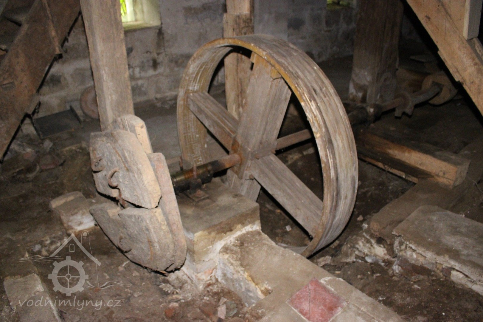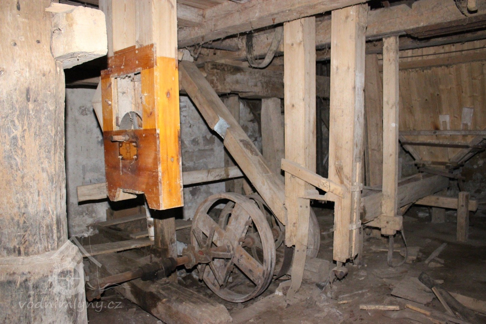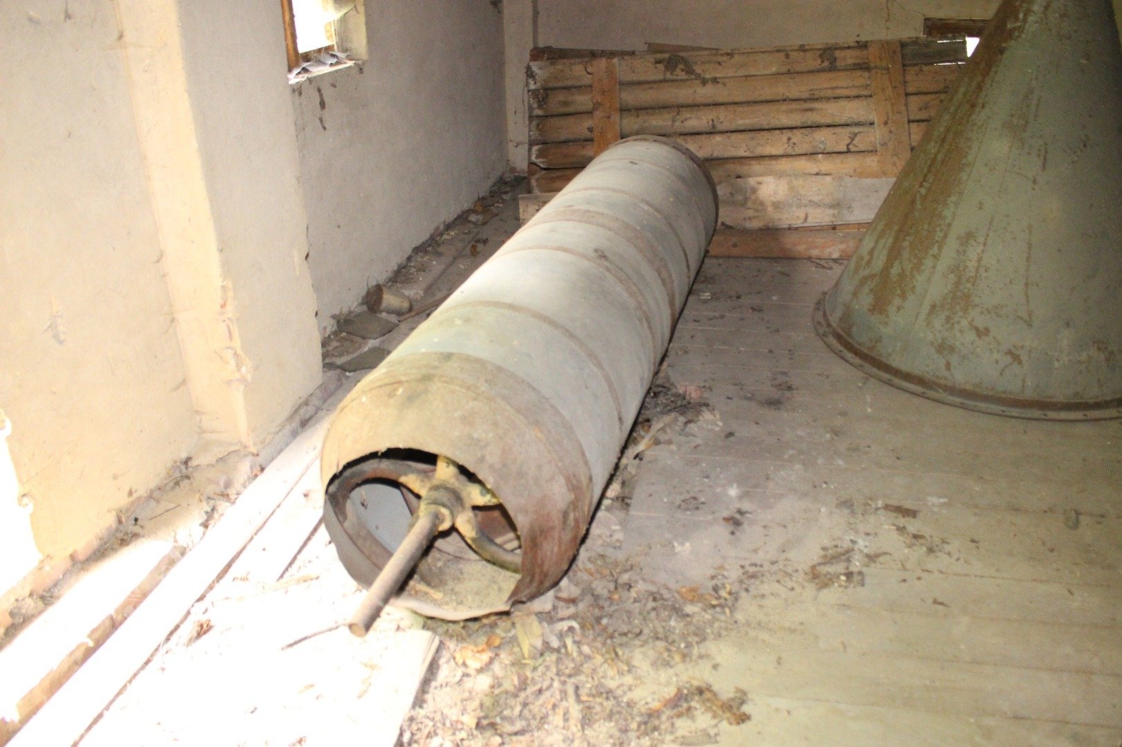 Torza válcových stolic, vlevo v latění stolice, kterou mlynář již nestačil zabudovat, 2019, © Václav Šolc, (Prvky na obrázku: válcová stolice)