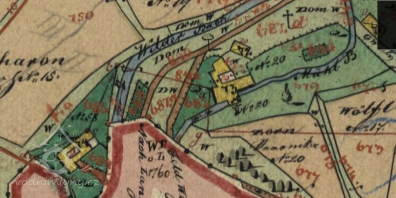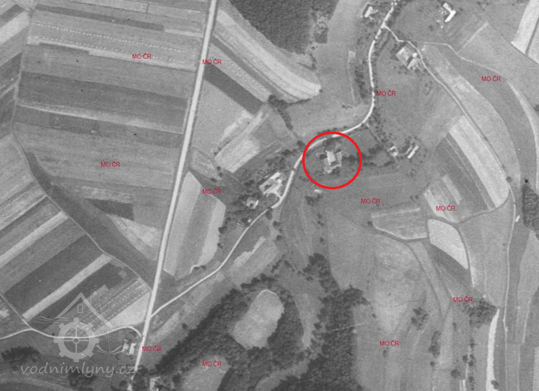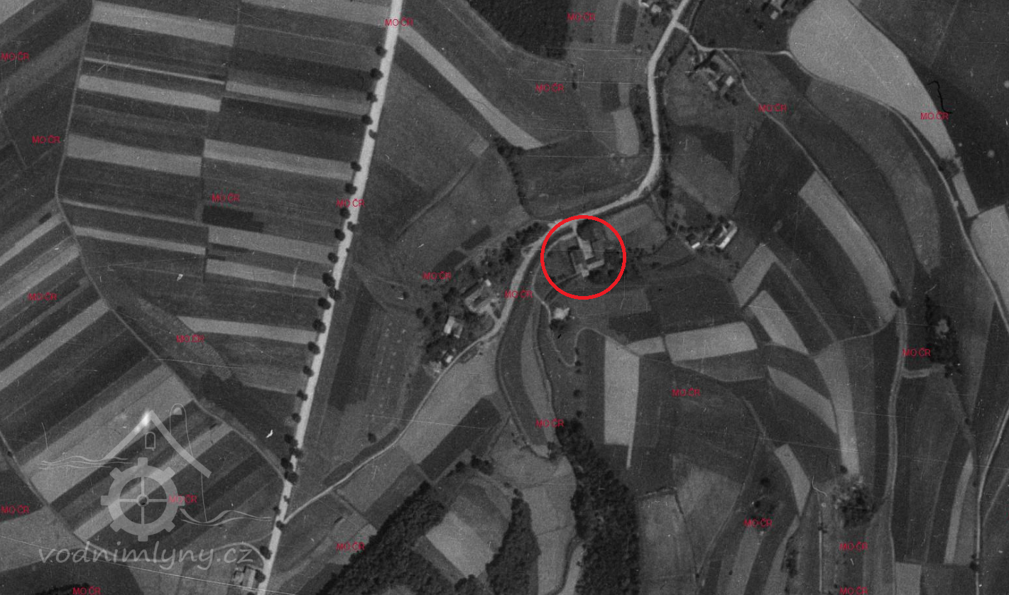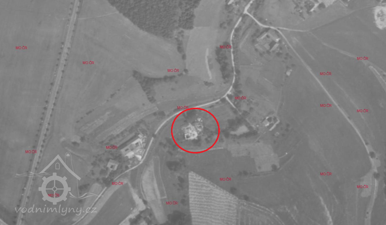 Mlýn stál ještě 1954; 1967 již v troskách.