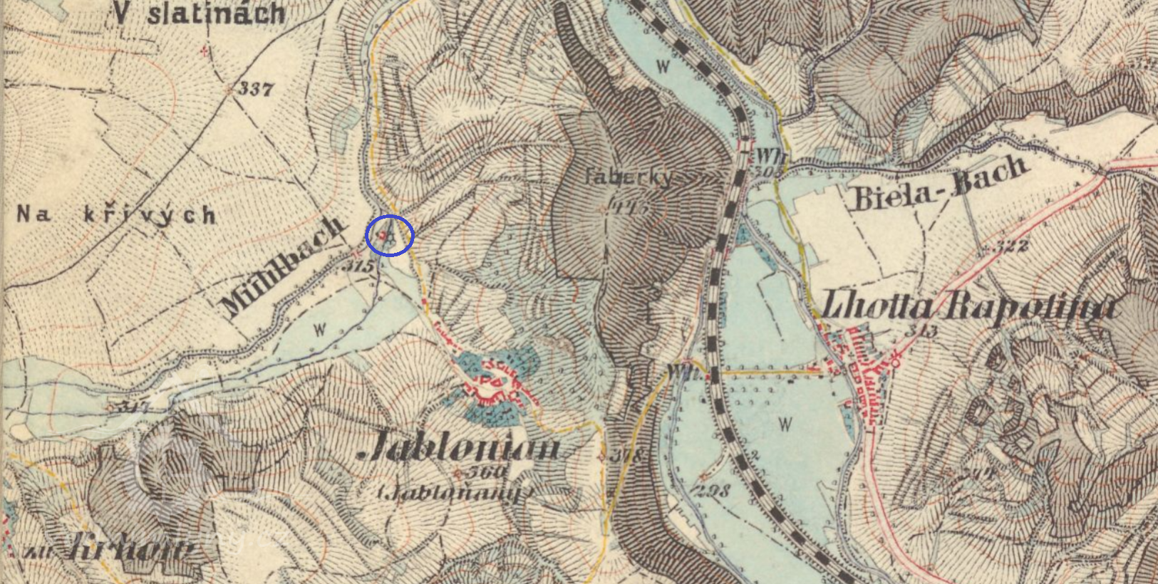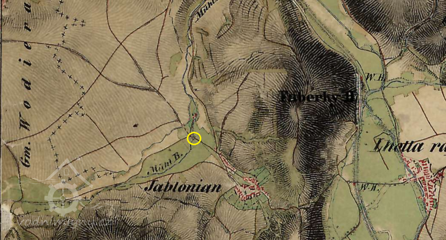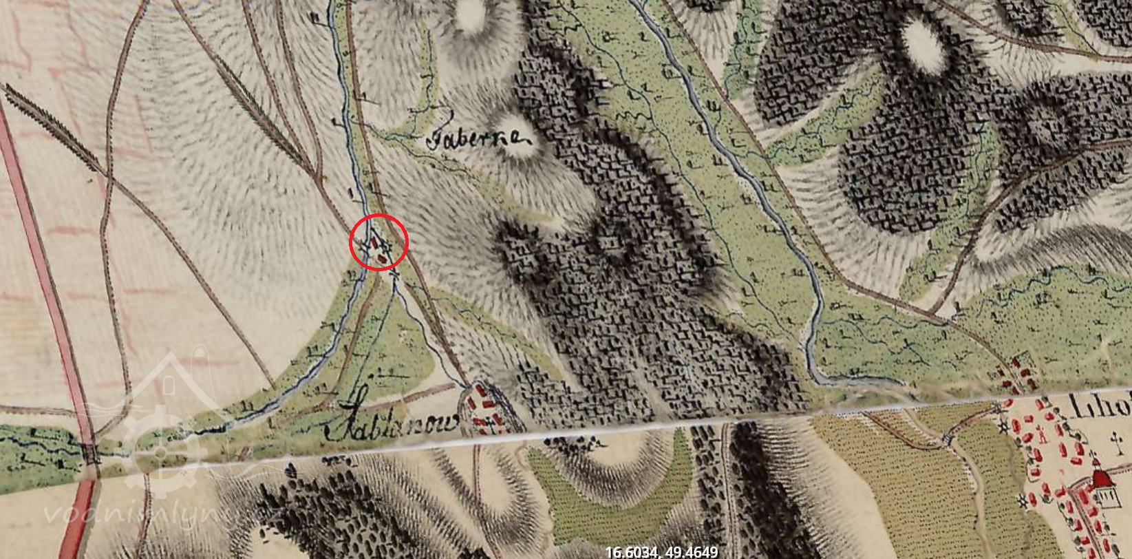 Bývalý vodní mlýn leží severozápadně pod obcí Jabloňany na pravém břehu potoka Úmoří na levém břehu náhonu.