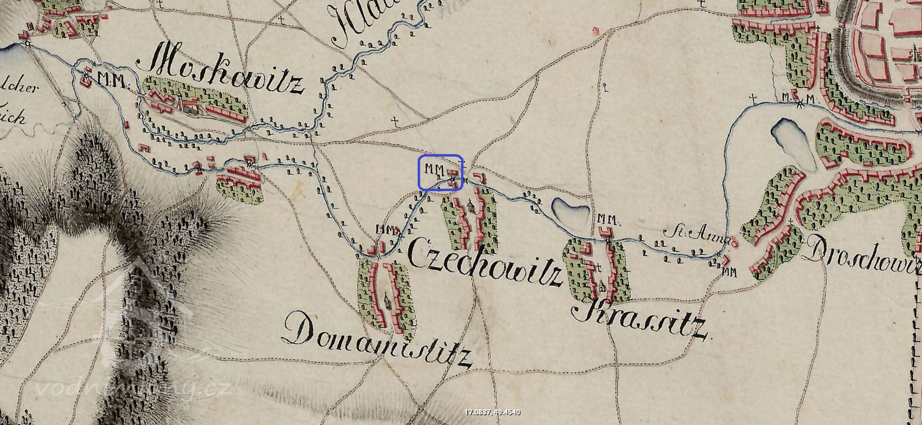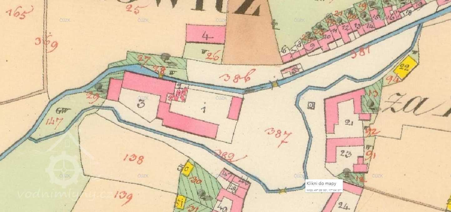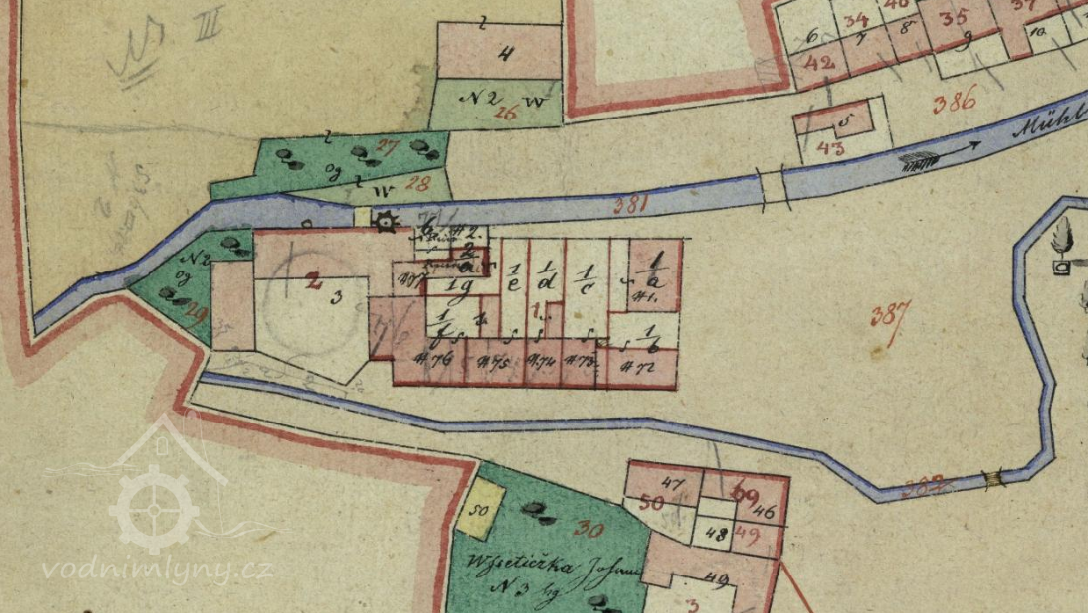 Popis1930: 1 kolo na svrchní vodu, hltnost 0,42 m3/s, spád 3,6 m, výkon 13 HP