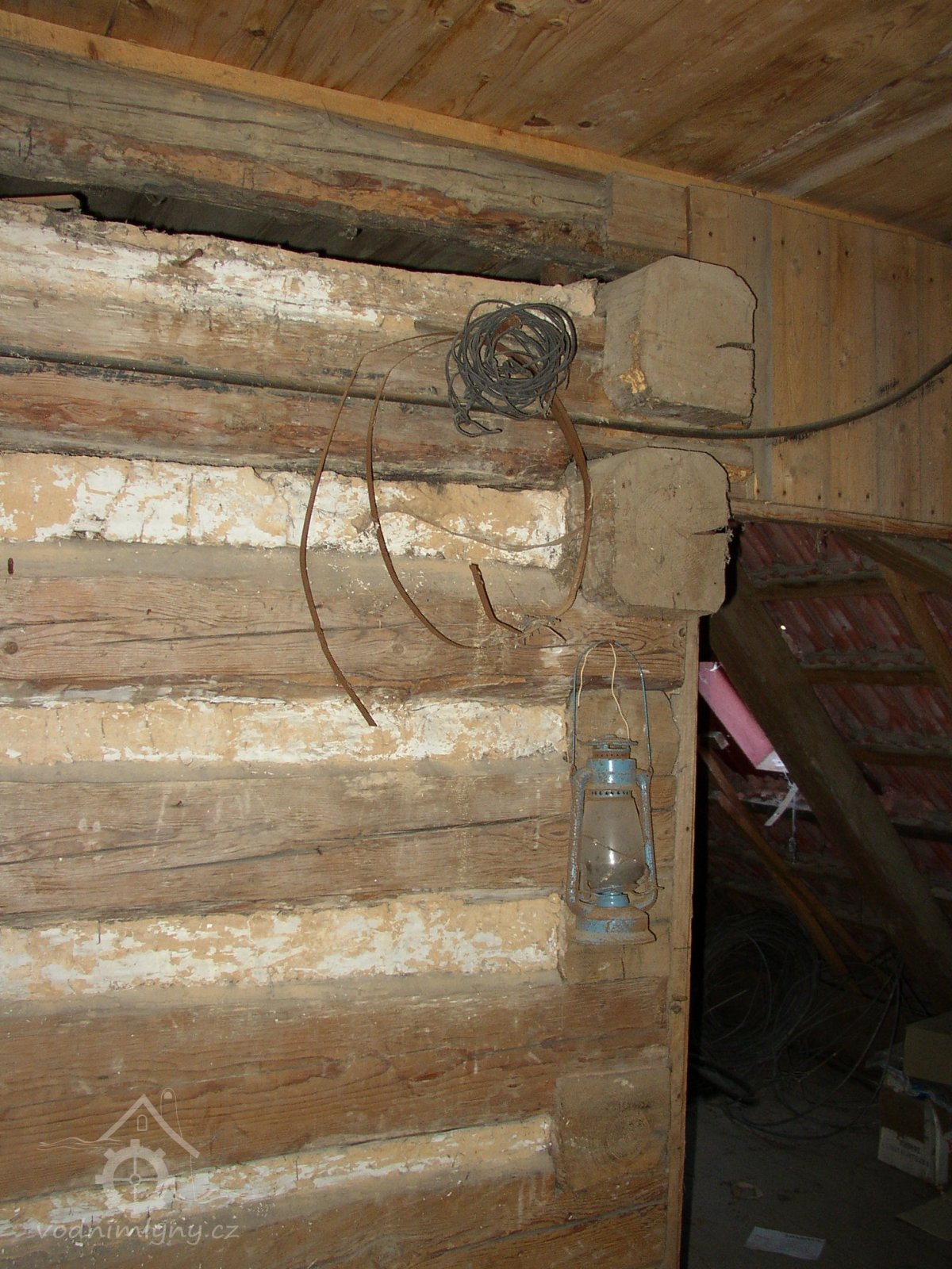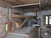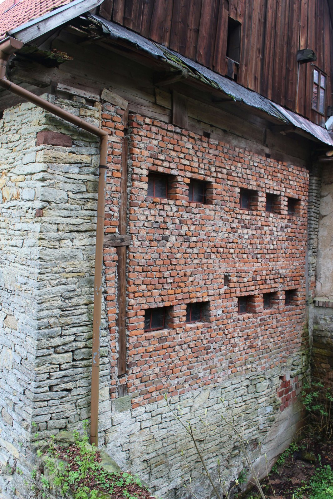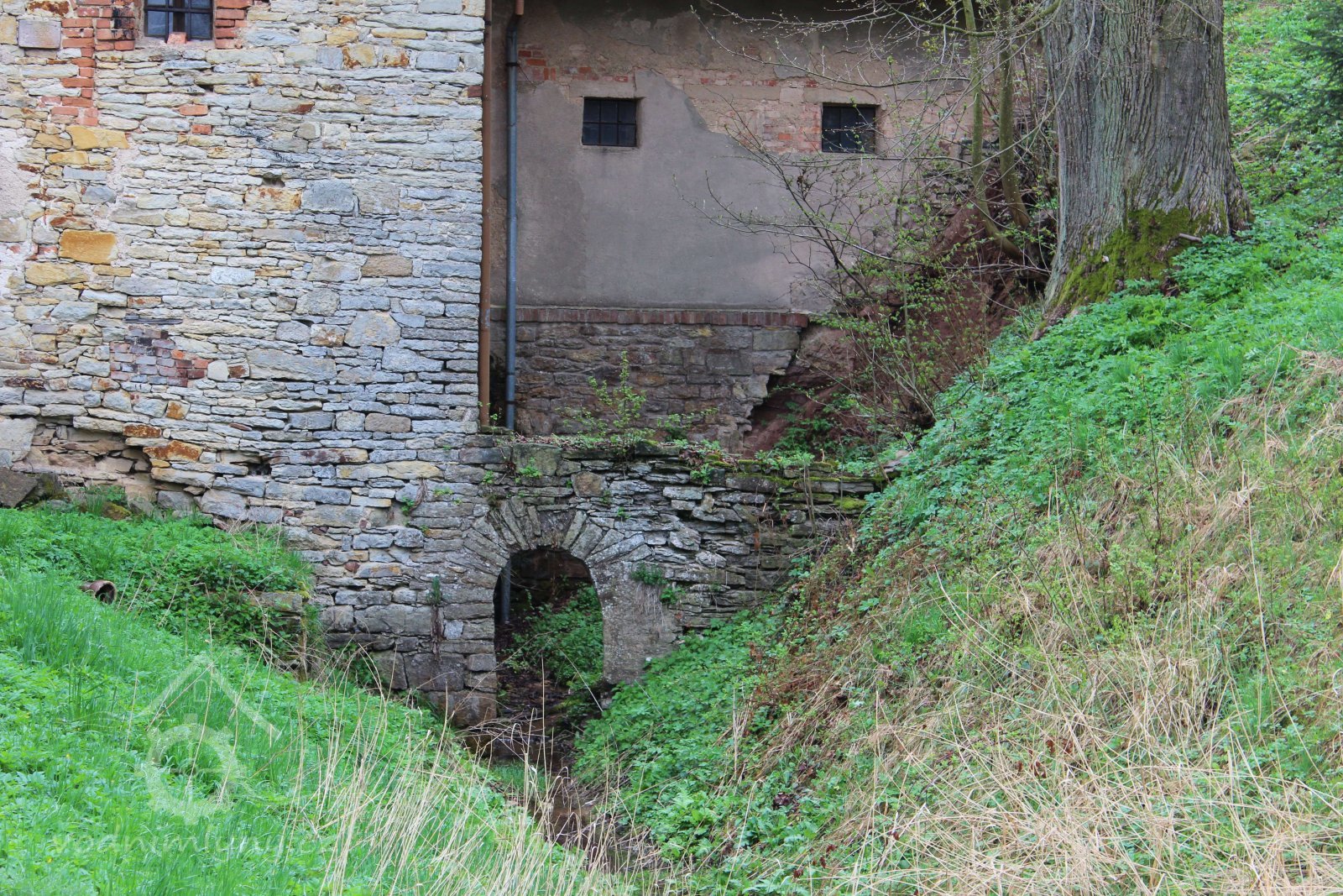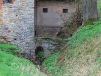 návodní strana, detail s patrným prvkem po původním roubení mlýna, 2013, © Klimešová