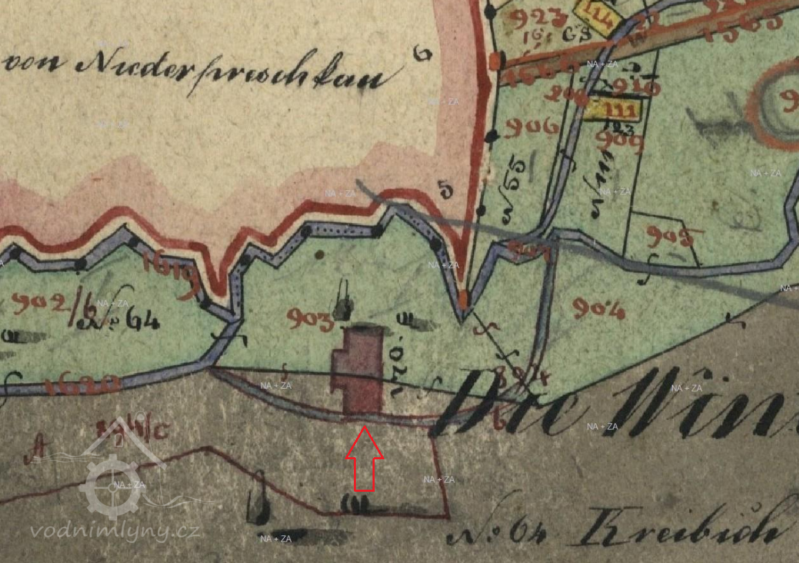 Mlýn byl založen přibližně v polovině 19. století. Je dodatečně dokreslen na mapách stabilního katastru z roku 1843. V soupisech poddaných do roku 1948 nebyl evidován. Jako prvního mlynáře zde matriky obce uvádějí v 50. letech 19. století Augustina Kreibicha, který byl současně pekařem. Jeho manželkou byla Karolina Storz, původem z Dolního Prysku.