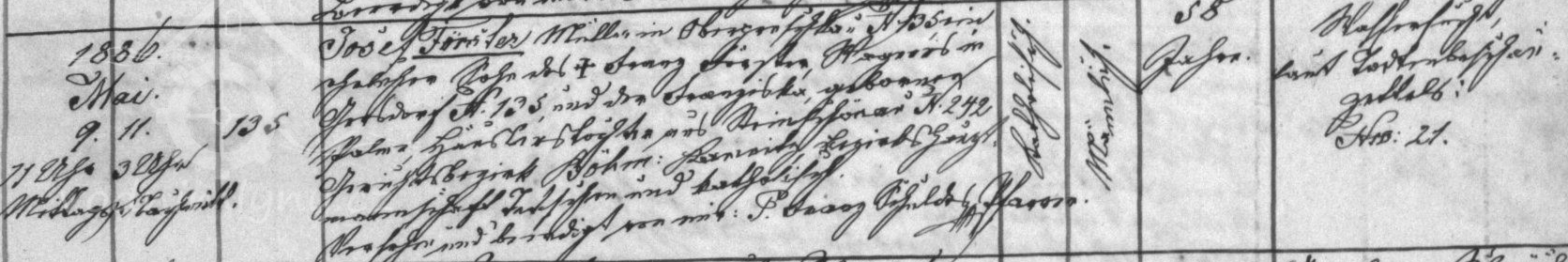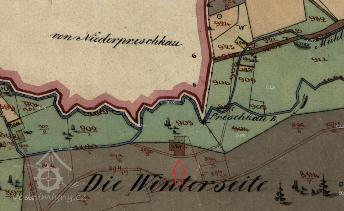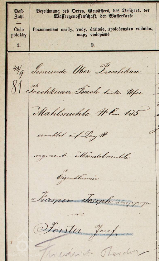 Na začátku 80. let 19. století byl majitelem mlýna Josef Förster, syn koláře Franze Förstera z obce Kerhartice. Jeho manželkou byla Katahrina, rozená Weiss. Josef Förster provozoval pouze mlýn, pekárnu při mlýně vedl najatý pekař Franz Passtel. Mlynář zemřel již v květnu 1886 ve věku 58 roků. Vdova Katharina se již v srpnu téhož roku provdala za pekaře Franze Passtela, který byl o 21 roků mladší: nevěstě bylo při sňatku 48, ženichovi necelých 27 roků.