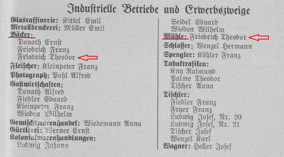 Adresář obce Horní Prysk z roku 1927 evidoval v čp. 135 jako majitele Theodora Friedricha s živnostmi mlynář a pekař. Stejná situace byla i v roce 1934.