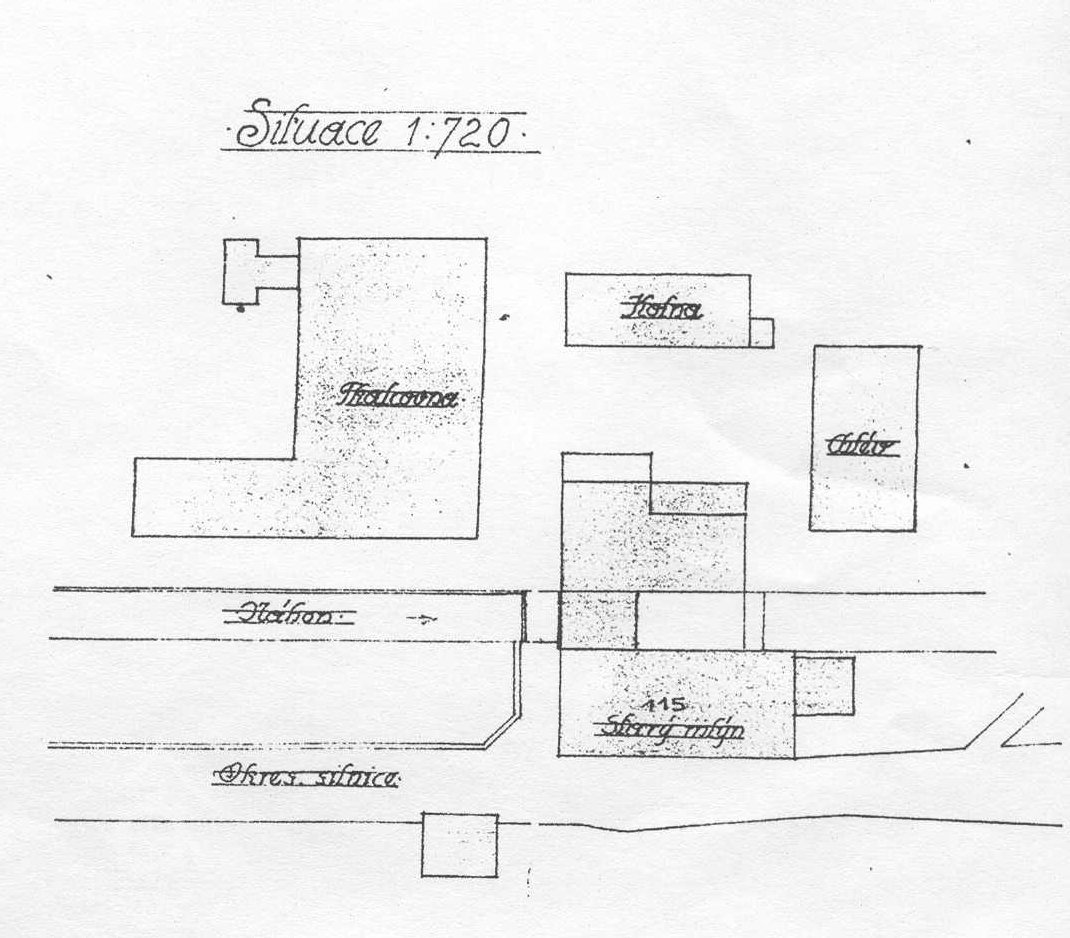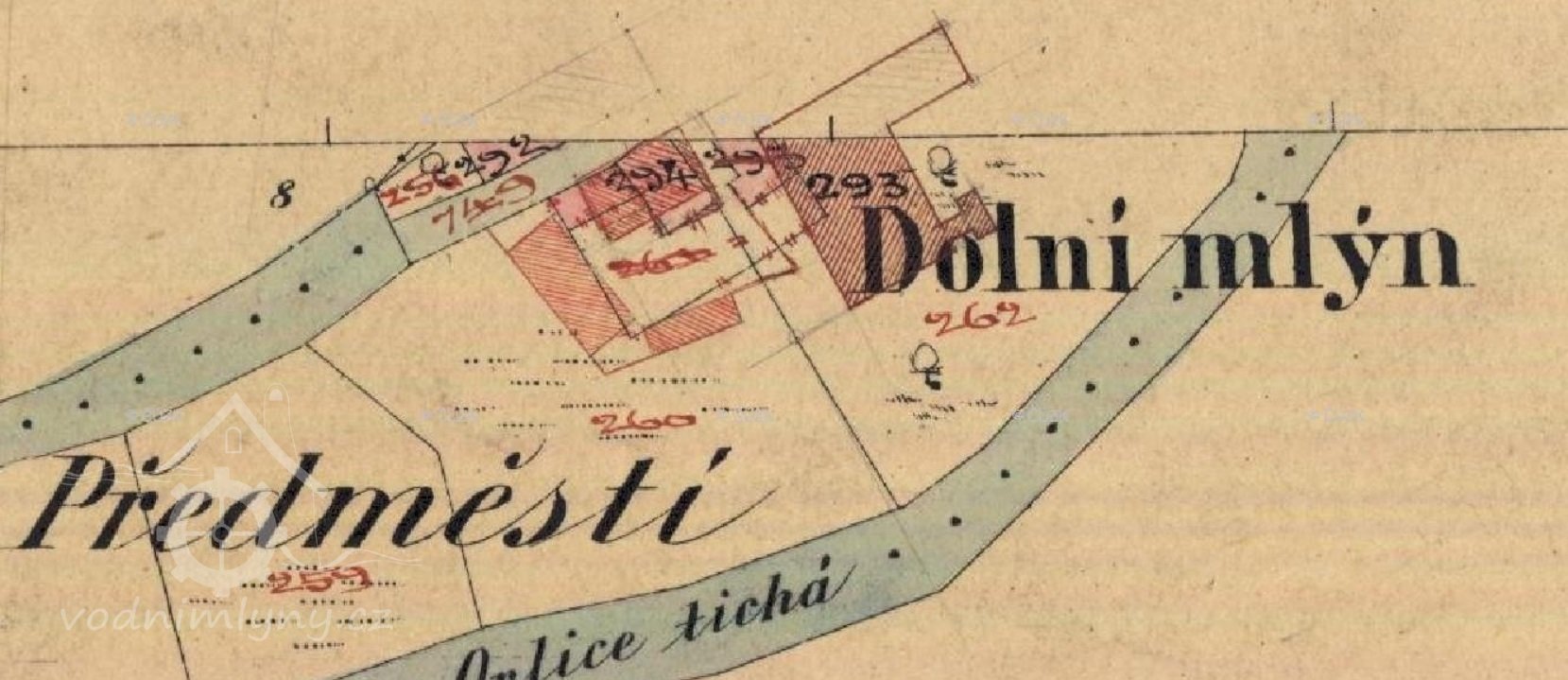 V Tereziánském katastru je uveden panský mlýn o jednom kole na nestálé vodě, užívaný vrchností. K roku 1714 je s olejnou. Starý mlýn stával blíže k cestě, mlecí stroje poháněla dvě kola. Z druhé strany náhonu stávala pila poháněná jedním kolem a stoupa, poháněná také jedním kolem.