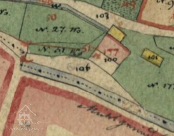 Nejstarší zmínka o tomto potštátském mlýnu čp. 177 je z roku 1892, kdy byla zřízena kamenná jezová křídla. Vodní mlýn, jehož kolo na svrchní vodu z Veličky bylo v roce 1928 nahrazeno Francisovou turbínou a k němuž byl v roce 1929 zřízen ham (vodní cejch), byl od roku 1942 mimo provoz. Tehdy byl majitelem mlýna Ferdinand Alka. 31. července 1945 byl mlýn úředně uzavřen a 8. srpna zaplombován.