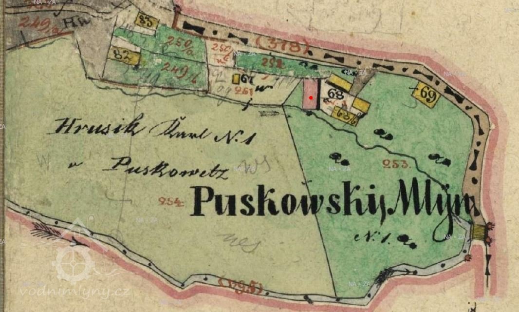 Pod martinovským dvorem s rozprostíraly ,,..... lúčky po hranicích pustkovskou a s lesem Okovicí, jenž v gruntě martinovské jest. .... po levé ruce lúčka Niva, která má náležeti do Pustkovce, poněvadž mlýnek někdy na gruntě pustkovském byl zbudován.