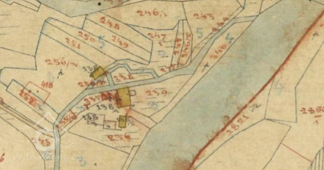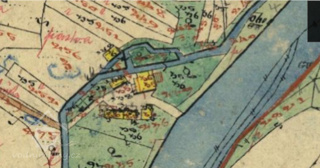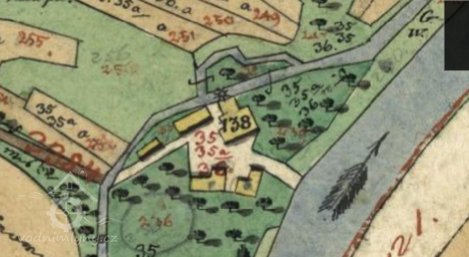Popis1930: 1 kolo na spodní vodu, hltnost 0,19 m3/s, spád 2,7 m, výkon 2 HP