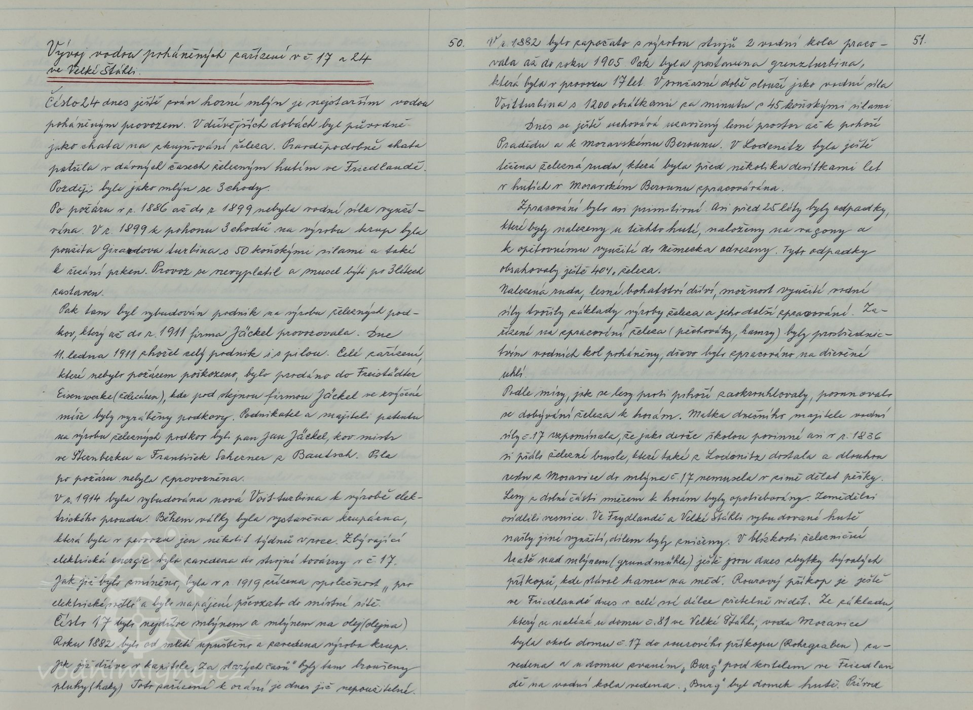 Pro strojní výrobu a mlýn obstarávala pohon dvě vodní kola až do roku 1905, kdy byla instalována turbína Girard, která sloužila 17 let, než byla nahrazena Francisovou turbínou.
