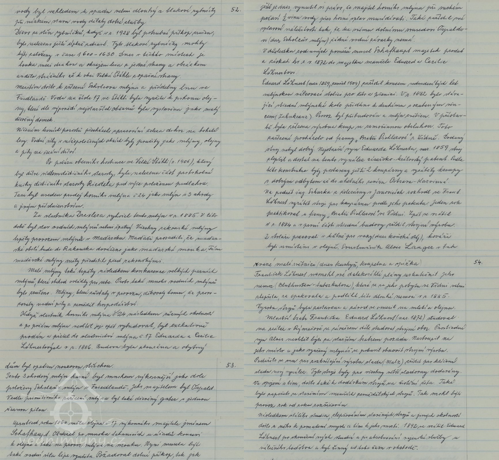 V roce 1860 získal majitel olejny Schafhaupt, po dlouhých tahanicích, koncesi na provoz moučného mlýna, ale již v roce 1872 se dostal do finančních potíží a musel mlýn prodat. Novými majiteli se stali manželé Eduard a Cecilie Löhnertovi. Eduard Löhnert koncem 70. let pořídil novou válcovou stolici pro mletí žita i pšenice. V roce 1882 bylo přidáno druhé vodní kolo a pořízen stroj na výrobu krup od Vídeňské firmi bratrů Pichlerových, který však nepracoval příliš dobře a proto ho nejstarší syn Eduarda Löhnerta Franz Löhnert upravil a na tuto úpravu získal i patent. Po roční praxi u Vídeňské firmi bratrů Pilhnerovích se vrátil domů a v roce 1884 zžídil strojní výrobu na výrobu strojů k výrobě krup podle svého patentu. Franz Löhnert však nestihl včechny své plány uskutečnit, neboť v roce 1885 zemřel na tuberkulozu a strojní výroba byla zastavena. Na post mlynáře nastoupil mladší bratr Franze, vyučený mlynář Alois, který po čase obnovil i strojní výrobu, kde zavedl výrobu strojů a zařízení pro sladovny, čištění obilí a později i zemědělských strojů. Pro velké pracovní nasazení u něho došlo, však k pomatení mysli a následné smrti. V roce 1892 se po studiích a vojenské službě vrátil do firmi nejmladší syn Eduarda Löhnerta (nar. 1829), Eduard Löhnert (nar. 1872) a zapojil se do fungování firmi, později firmu zdědil.