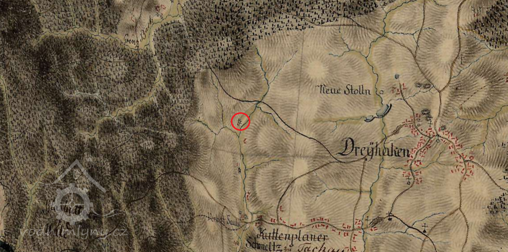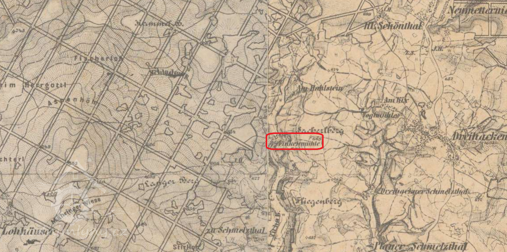 Nejstarším z pěti mlýnů, které stály v obci Tachovská Huť byl Finkenmühle s čp. 48. Zprávy o existenci mlýna jsou z roku 1838. Mlýn stál po pravé straně okresní cesty z Mariánských Lázní do Mähringu, v místech, kde cesta prudce zahýbala doleva, za mostkem přes potok Tichá. Mlýn stál na pravém břehu potoka. V okolí stály ještě další čtyři domy, pro všechny sloužila pitná voda ze studny u mlýna.