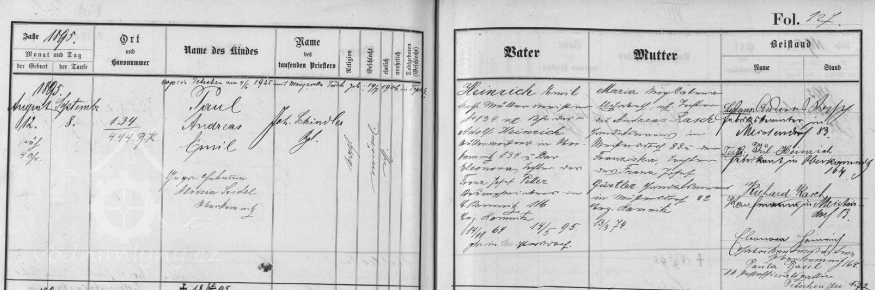 V 90. letech 19. století hospodařil na mlýně Adolfův syn Emil Heinrich, který se oženil s Marií Magdalenou Rasch z Mistrovic. Za něj došlo k převedení mlýna pod obce Česká Kamenice, kde mlýn dostal nové čp. 444. V roce 1895 při narození syna, který dostal při křtu jména Paul Andreas Emil, je tato změna v matričním zápisem vyznačena oběma čísly popisnými a zkratkou B. K. (Böhmisch Kamnitz) u nového čp. 444, při narození dcery Elisabeth o rok později je mlýn uváděn již pouze s novým čp. 444.