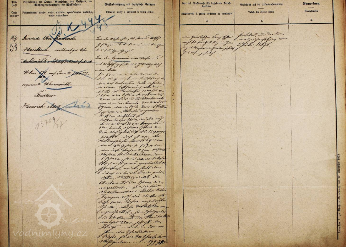Rovněž původní zápis ve vodní knize byl dodatečně upraven v souvislosti s převedením a přečíslování mlýna. Součástí opraveného zápisu ve vodní knize bylo společné uvedení také mladšího textilního provozu čp. 445 pod jedním zápisem s čp. 444 a s uvedením dvou živností obilný mlýn a přádelna ovčí vlny. Oba provozy tehdy tvořily pravděpodobně jeden celek se společným majitelem. Vodní provoz čp. 445 ležel několik desítek metrů výše na stejném náhonu a do dnešní doby se z něj zachovalo pouze malé rozvaliny zarostlé stromy. Budova s čp. 444 se dochovala do dnešní doby.