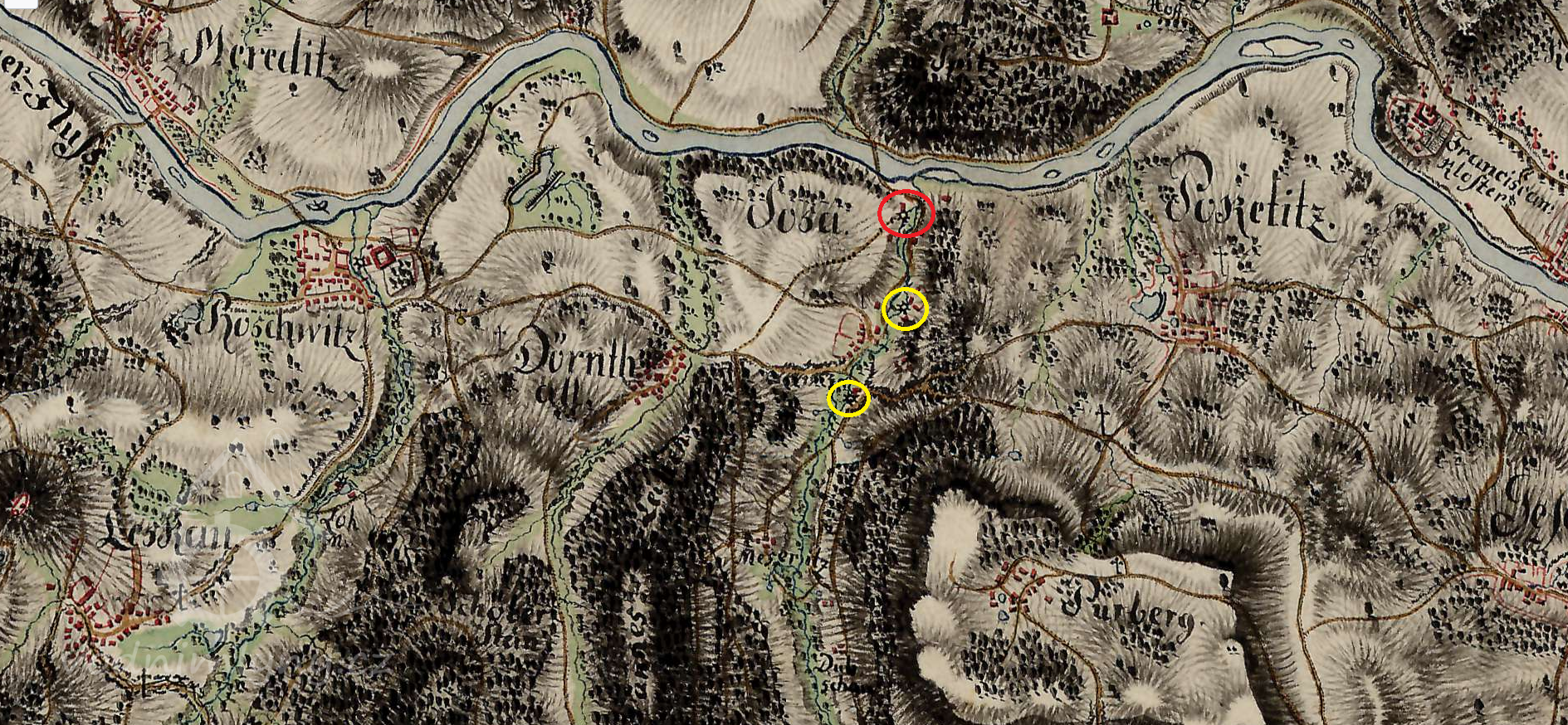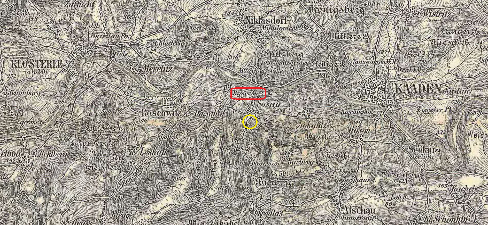 Původně papírna na soutoku Donínského potoku s Ohří, 1930 registrováno jako obilní mlýn. Mlýniště se dnes nachází pod hladinou Ohře.