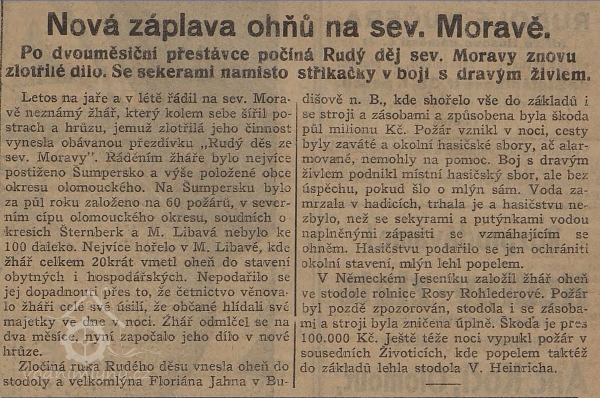 1933 v prosinci vyhořel až do základů, byv zapálen neznámým žhářem, který řádil v širokém okolí, škoda 500.000 Kč