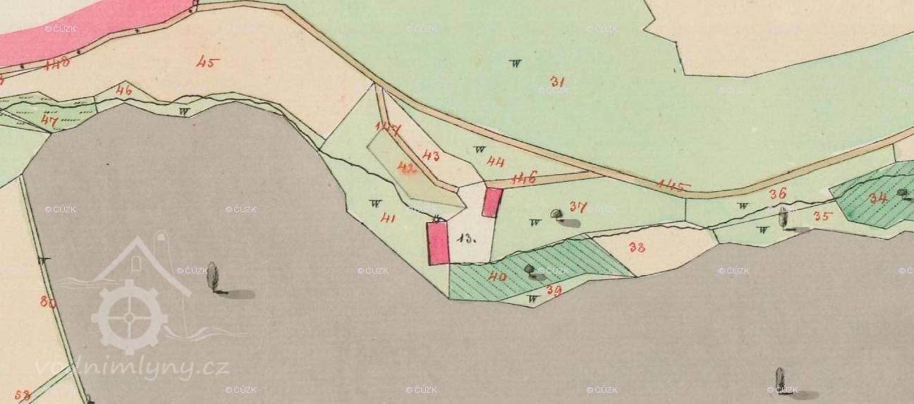 Zchátralá budova mlýna stojí o samotě na levém břehu Přemyšlenského potoka. Developerská firma plánuje mlýn zrekonstruovat na byty a v jeho okolí vybudovat nové vily.