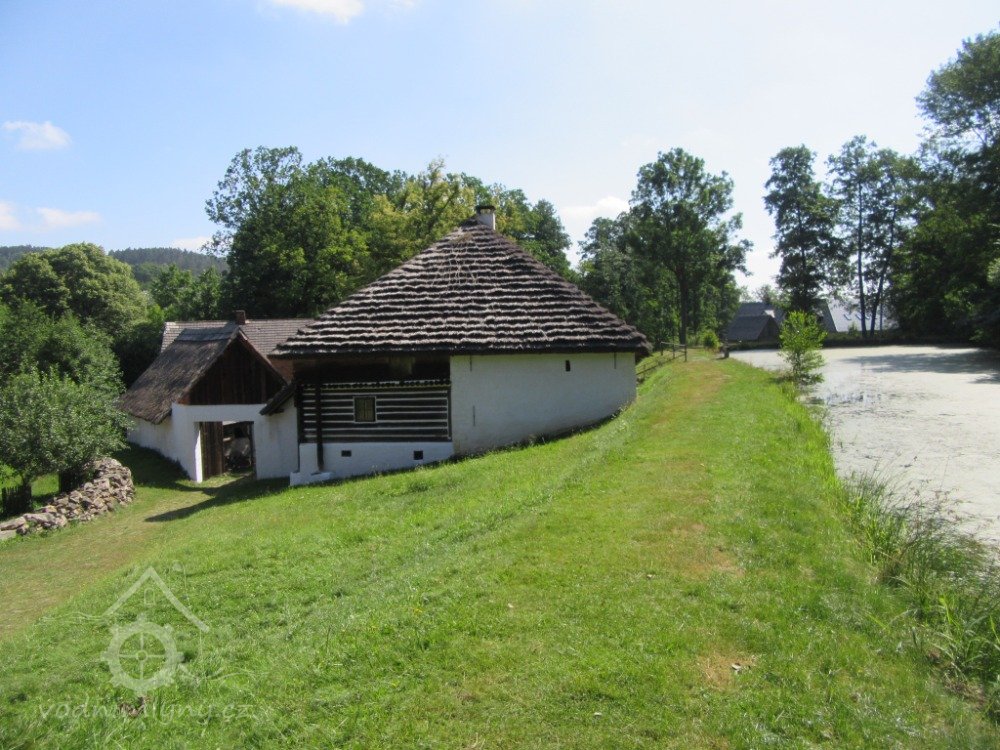 Průčelí mlýna s mlýnicí (vlevo od vchodu) a obytnou částí. Stav před zahájením záchranných prací. Mlýnice ukrývá ucelené nejstarší české složení s pozůstatky kladivové krupní stoupy. Vpravo vpředu chlév s kolnou, vzadu stodola, vše kryto došky., 2006, © Ivo Hořejš