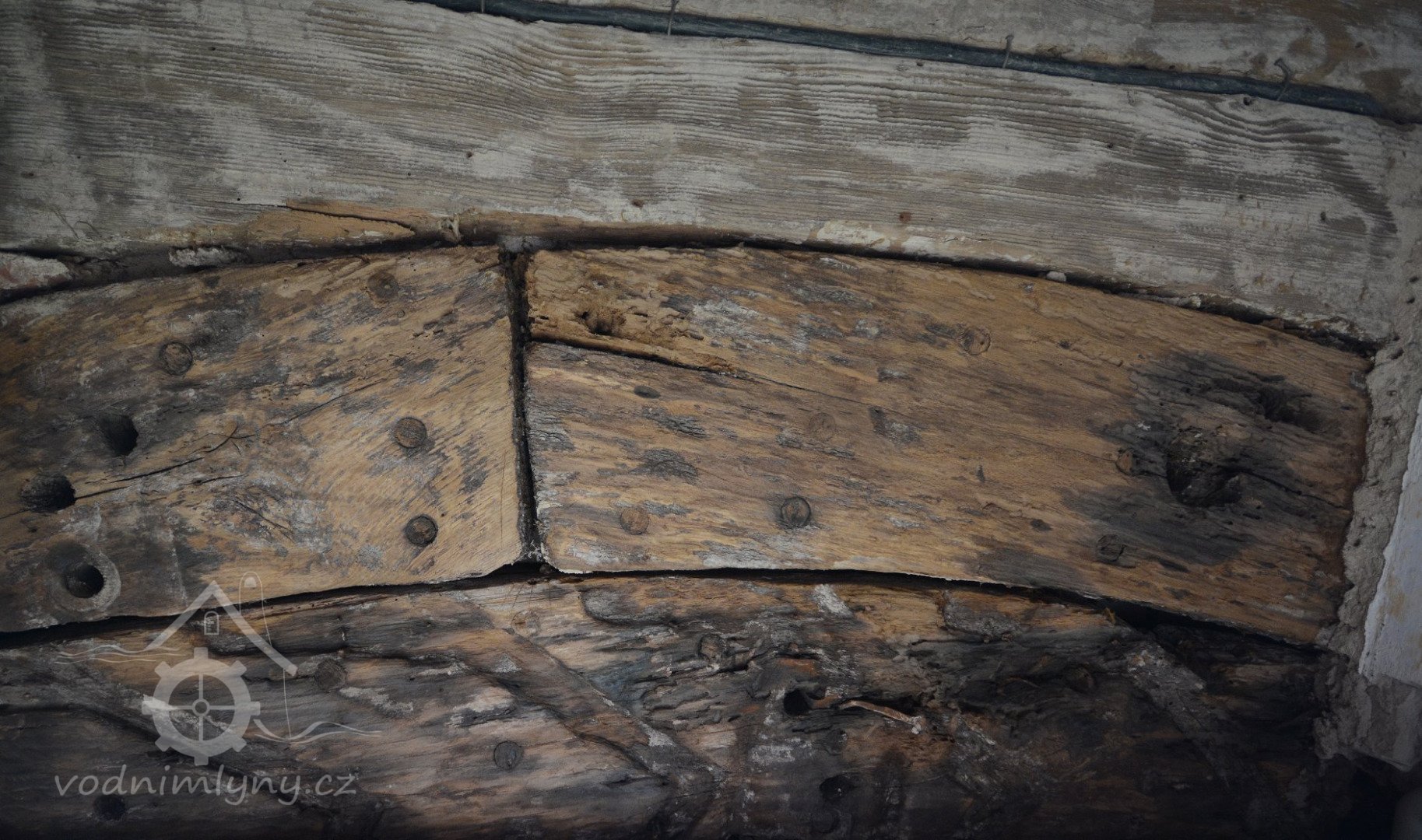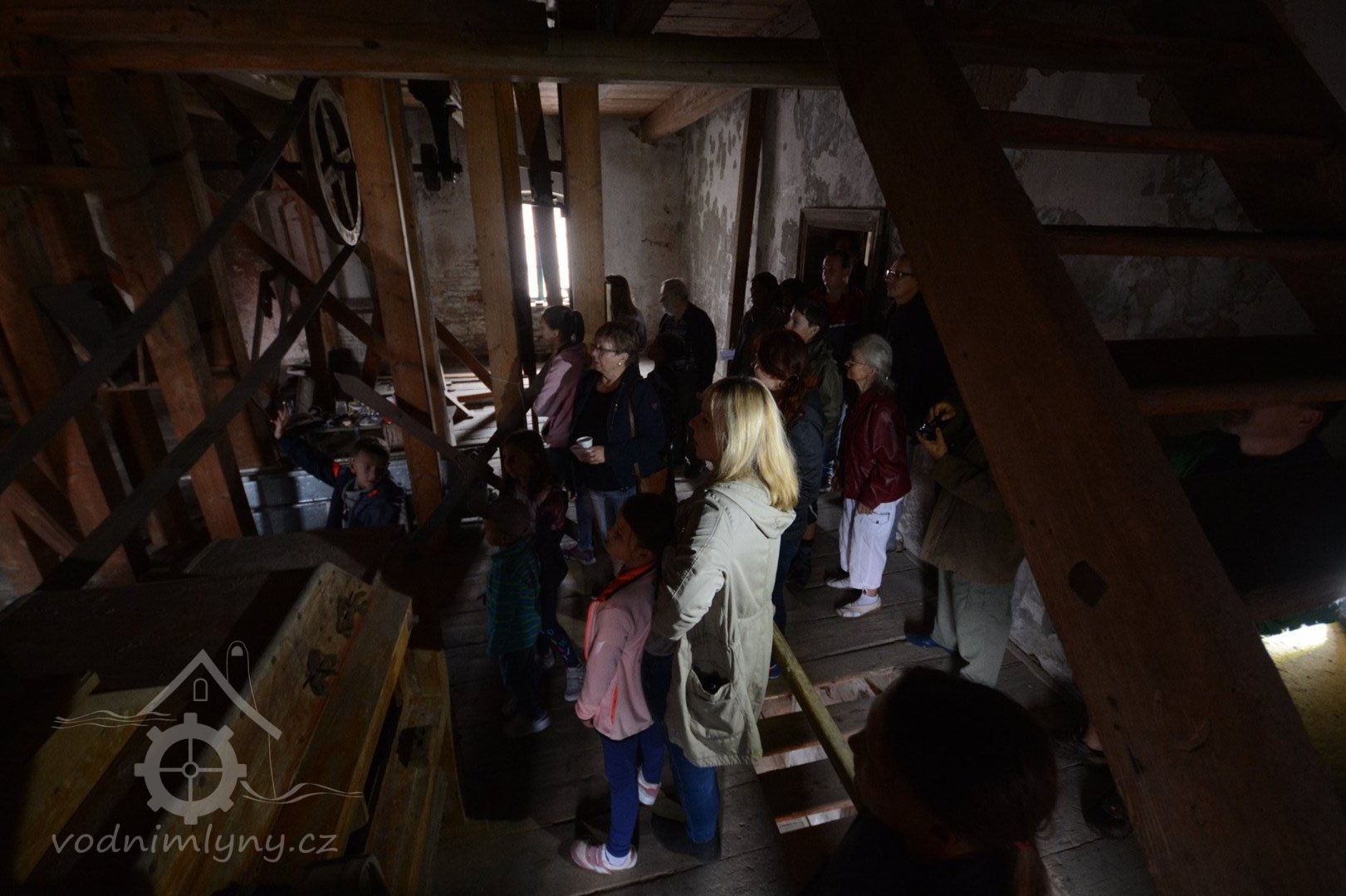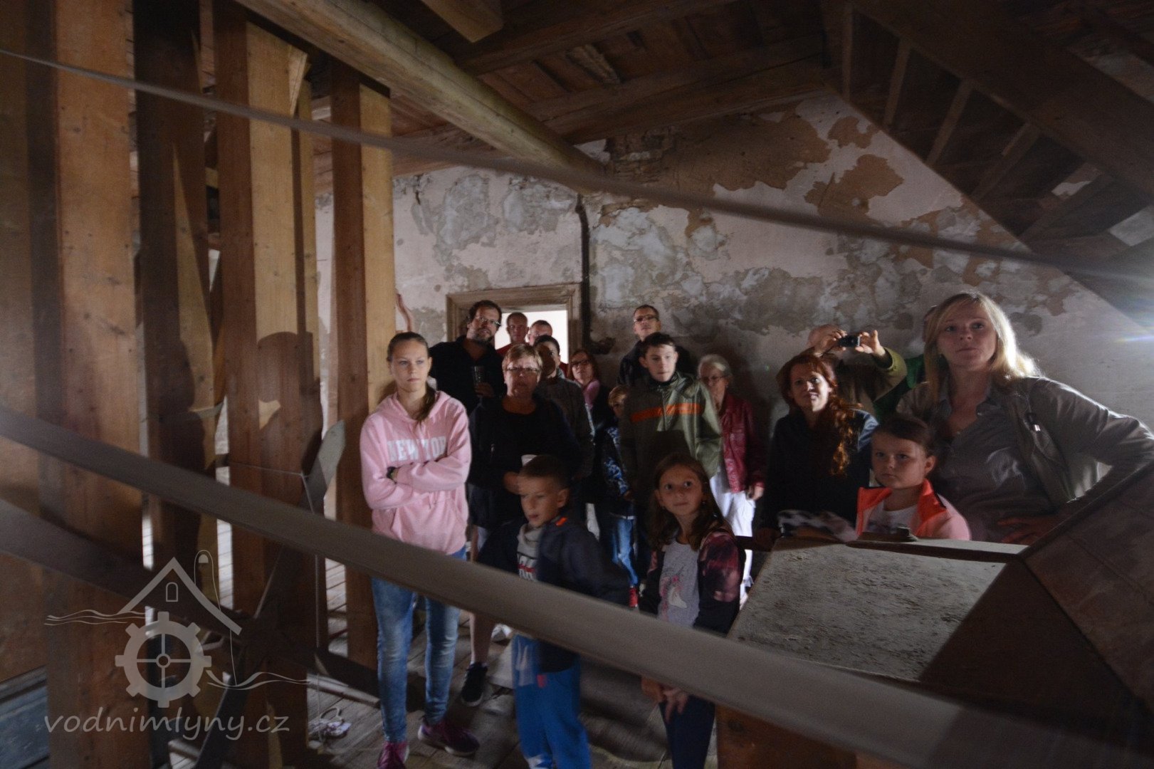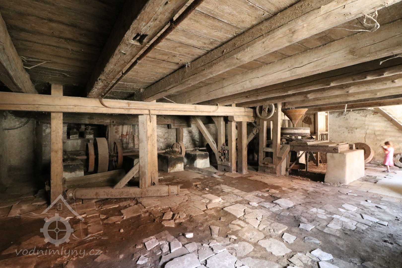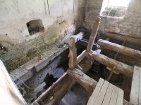 Pohled do podkolí, srpen 2018, © Šimek, (Prvky na obrázku: transmise, řemenice, převody, transmise, řemenice, převody - transmisní hřídele s řemenicemi (výrobek průmyslový i řemeslný))