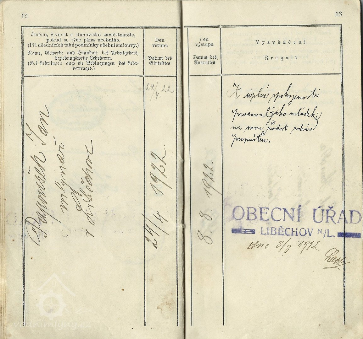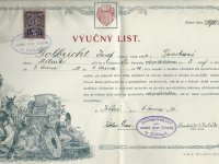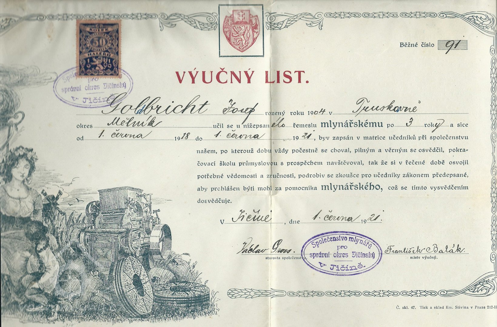 Výuční list Josefa Golbrichta, 1921, © Umělecký mlýn Liběchov, (Prvky na obrázku: výuční list)