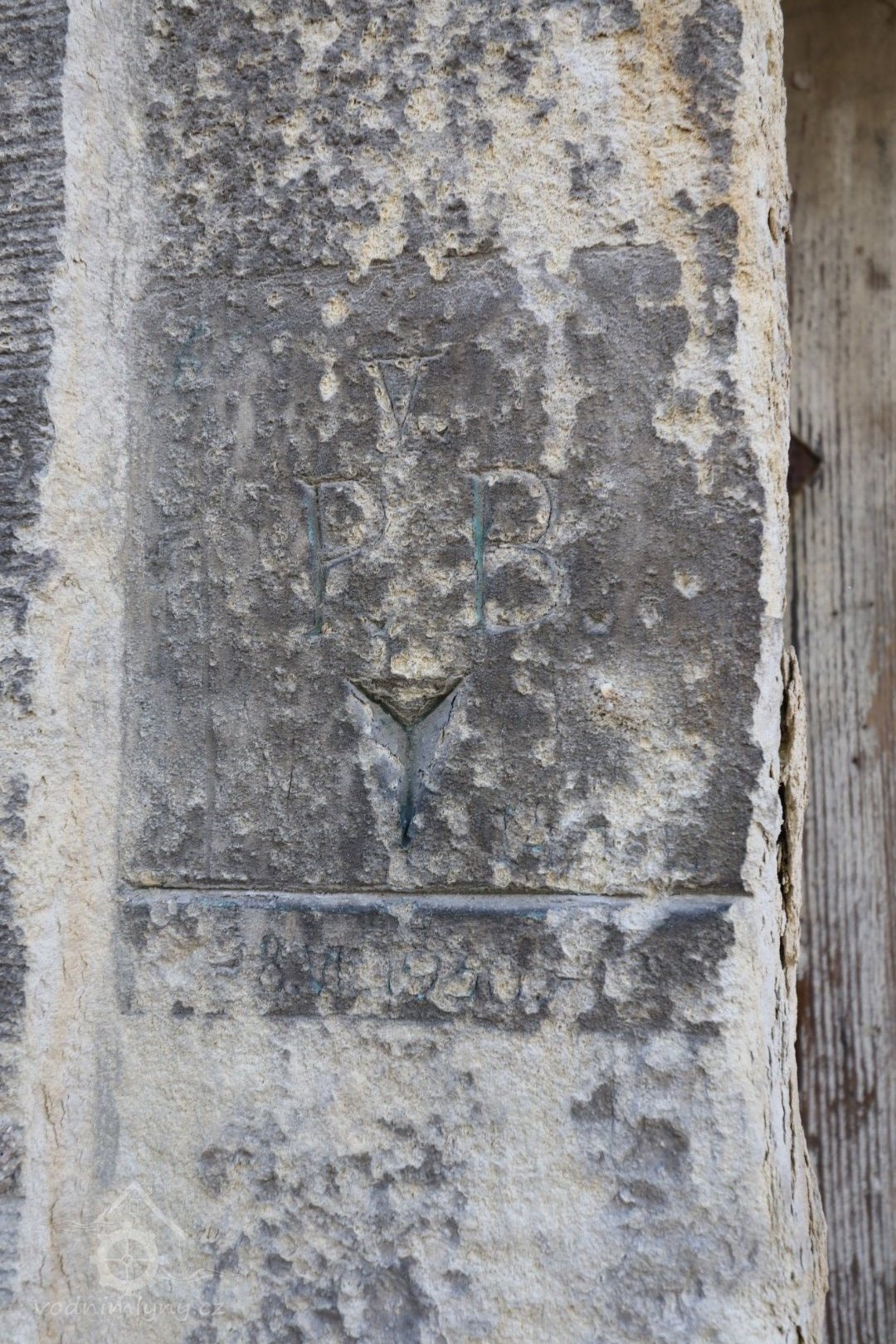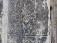 Normální znamení vytesané na kamenném ostění hlavních dveří, srpen 2018, © Šimek, (Prvky na obrázku: normální znamení)