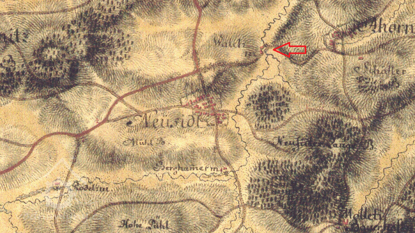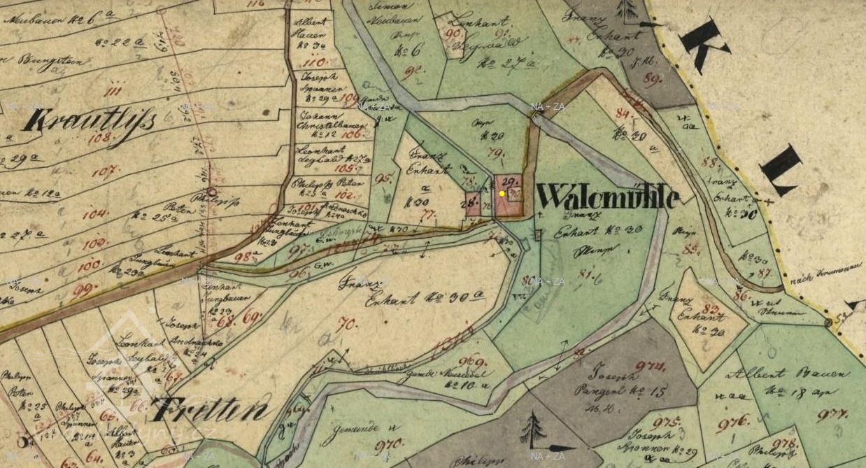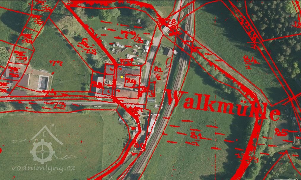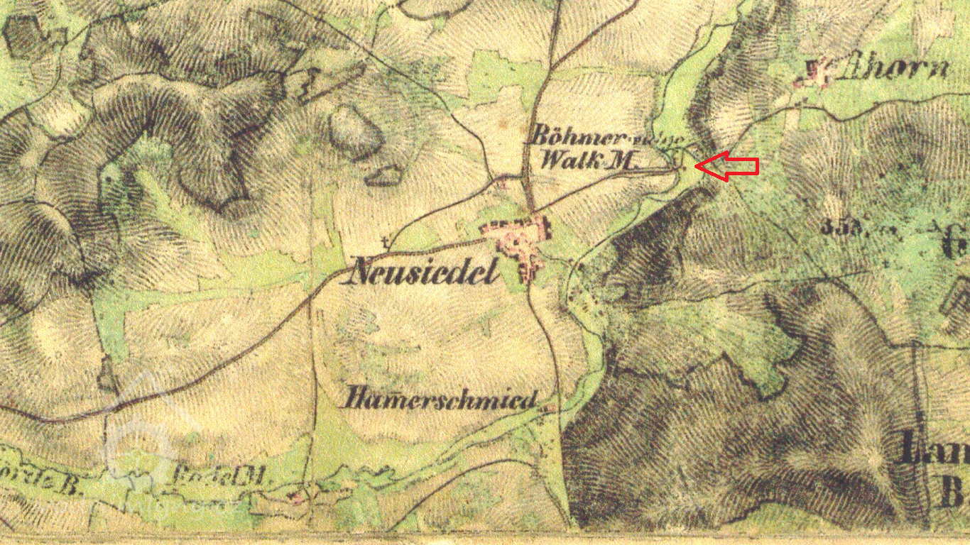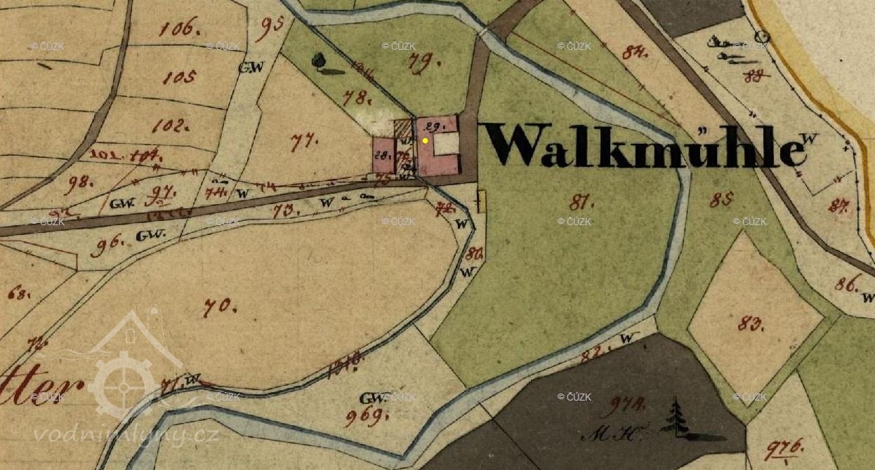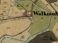 Vodní dílo je zachyceno již na mapě I. a II. voj. mapování, mlýn je v té době ještě označován jako valcha. V roce 1826 valchu vlastní Franz Erkart.