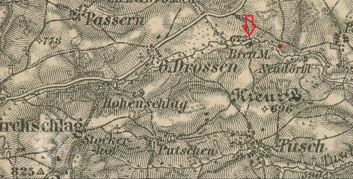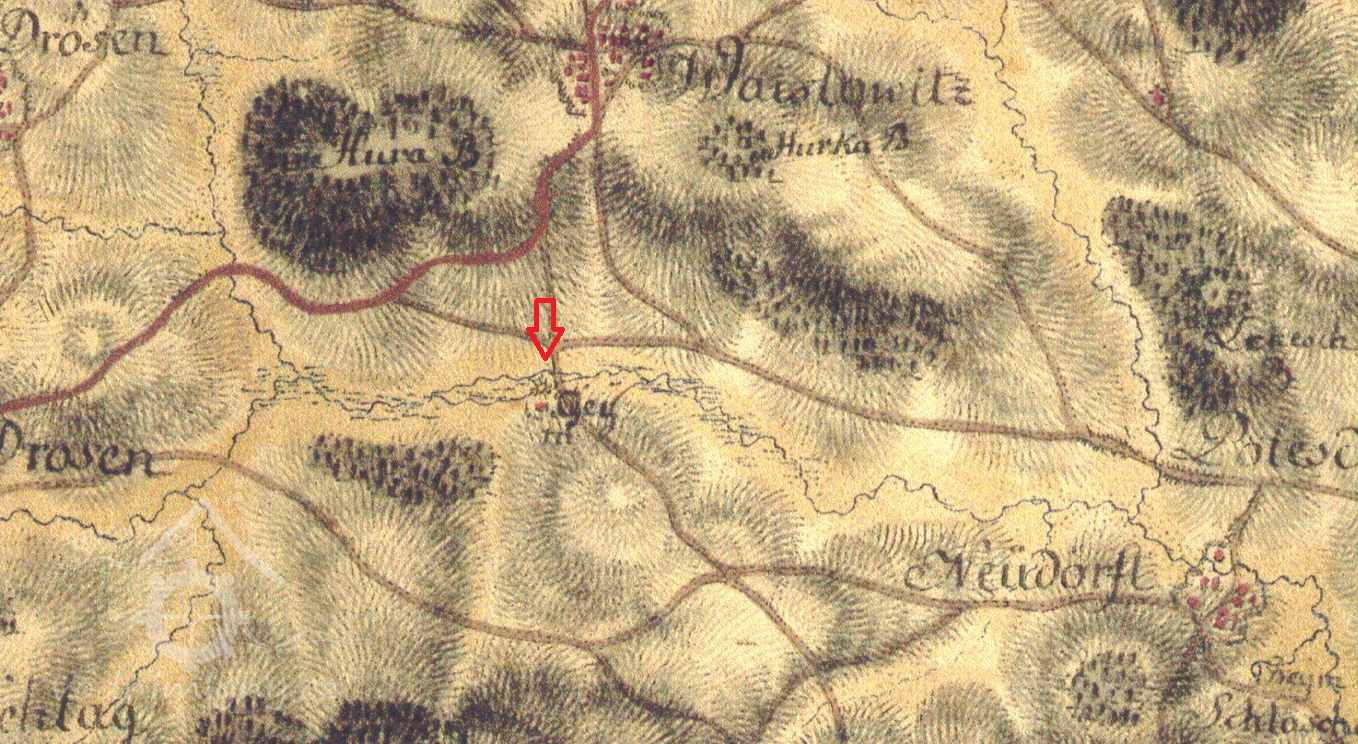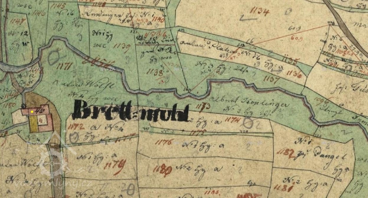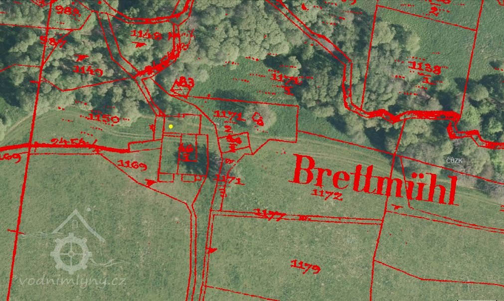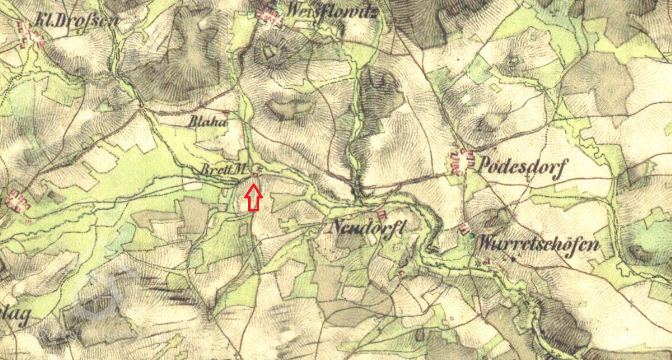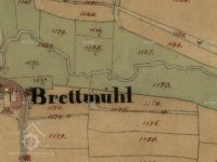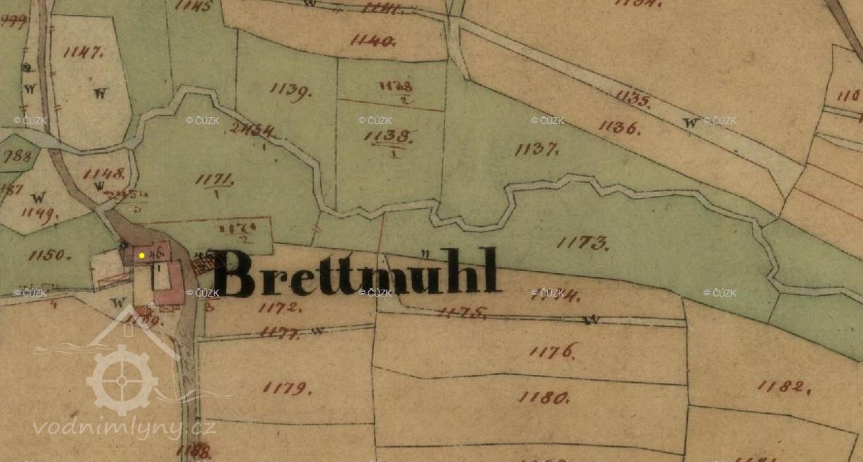 Mlýn je zachycen již na mapě I. voj. mapování, označen jako Gey mühle. V roce 1826 vlastní mlýn označovaný jako Brett-mühl Anton Wolfl.