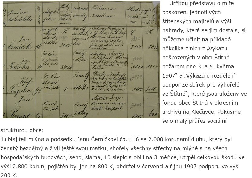 Majiteli mlýna a podsedku Janu Černíčkovi čp. 116 se 2.000 korunami dluhu, který byl ženatý bezdětný a živil ještě svou matku, shořely všechny střechy na mlýně a na všech hospodářských budovách, seno, sláma, 10 slepic a obilí na 3 měřice, utrpěl celkovou škodu ve výši 2.800 korun, pojištěn byl jen na 800 K, obdržel v červenci a říjnu 1907 podporu ve výši 200 K.